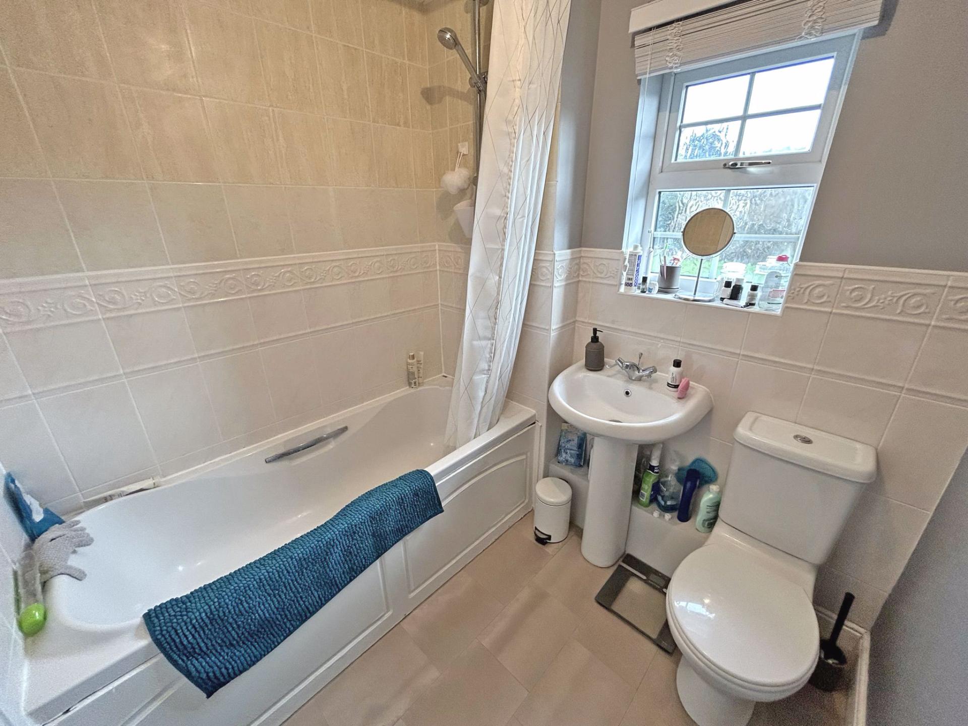 Obscure uPVC double glazed window to rear aspect. White suite comprising a panelled bath with fully tiled walls over, bath shower mixer tap with wall mounted rail and shower head, shower curtain, pedestal wash basin, and WC. Lino floor covering. Radiator. Light and shaver point. Ceiling extractor.