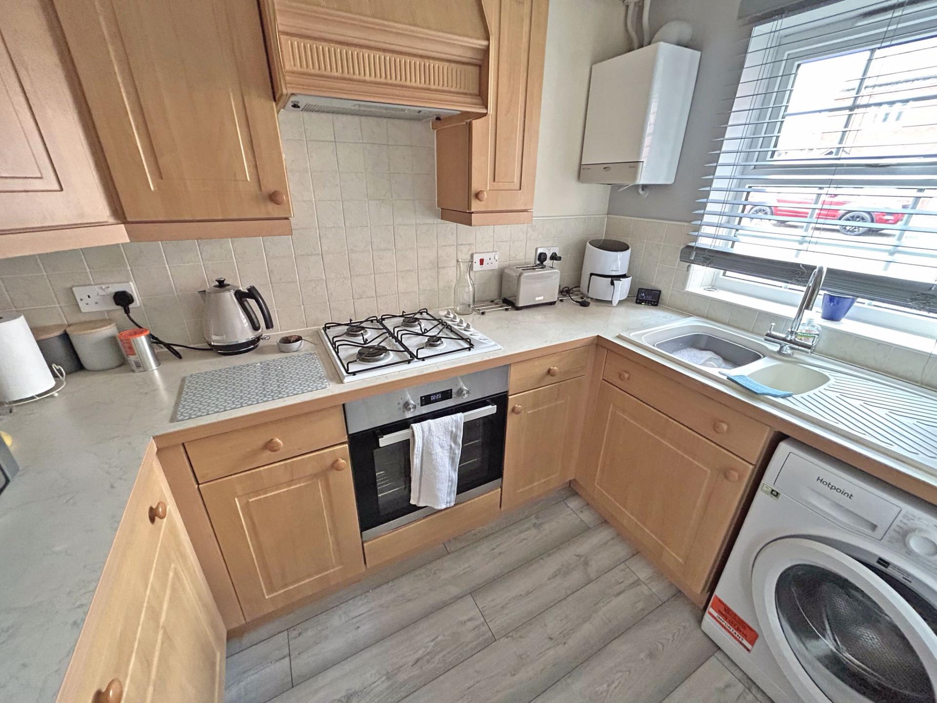 2.66m x 1.91m (8’08 x 6’03) uPVC double glazed window with a pleasant outlook to the front. A fitted kitchen comprising a range of floor standing and wall mounted cupboards with beech coloured Shaker style door and drawer fronts, co-ordinated work surfaces and tiled splashbacks, one and a half bowl sink incorporating draining unit, built-in single electric fan assisted oven, and four burner gas hob with extractor over. Space for a free standing fridge/freezer. Space for washing machine. Wall hung gas fired boiler for central heating and hot water. Extractor fan. Central heating programmer. Carbon monoxide alarm.