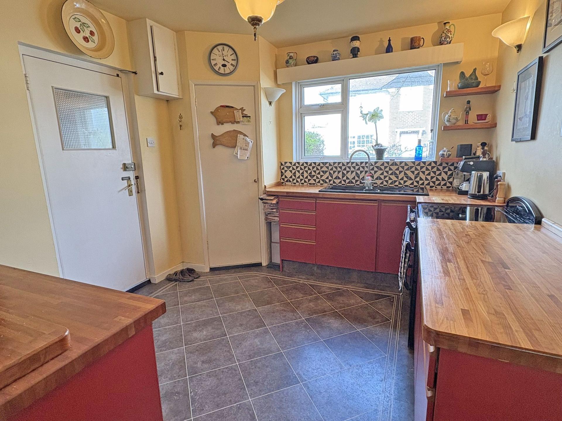 3.64m (11’11) x 3.04m (9’11) Double glazed window to the front aspect. Fitted kitchen comprising a range of base units finished with red door and drawer fronts. Butchers block worksurfaces. One and a half bowl ceramic sink incorporating drainer. Freestanding electric cooker. Freestanding fridge/freezer. Tile effect floor covering. Pantry with shelving and fuse boards. Wall lights.