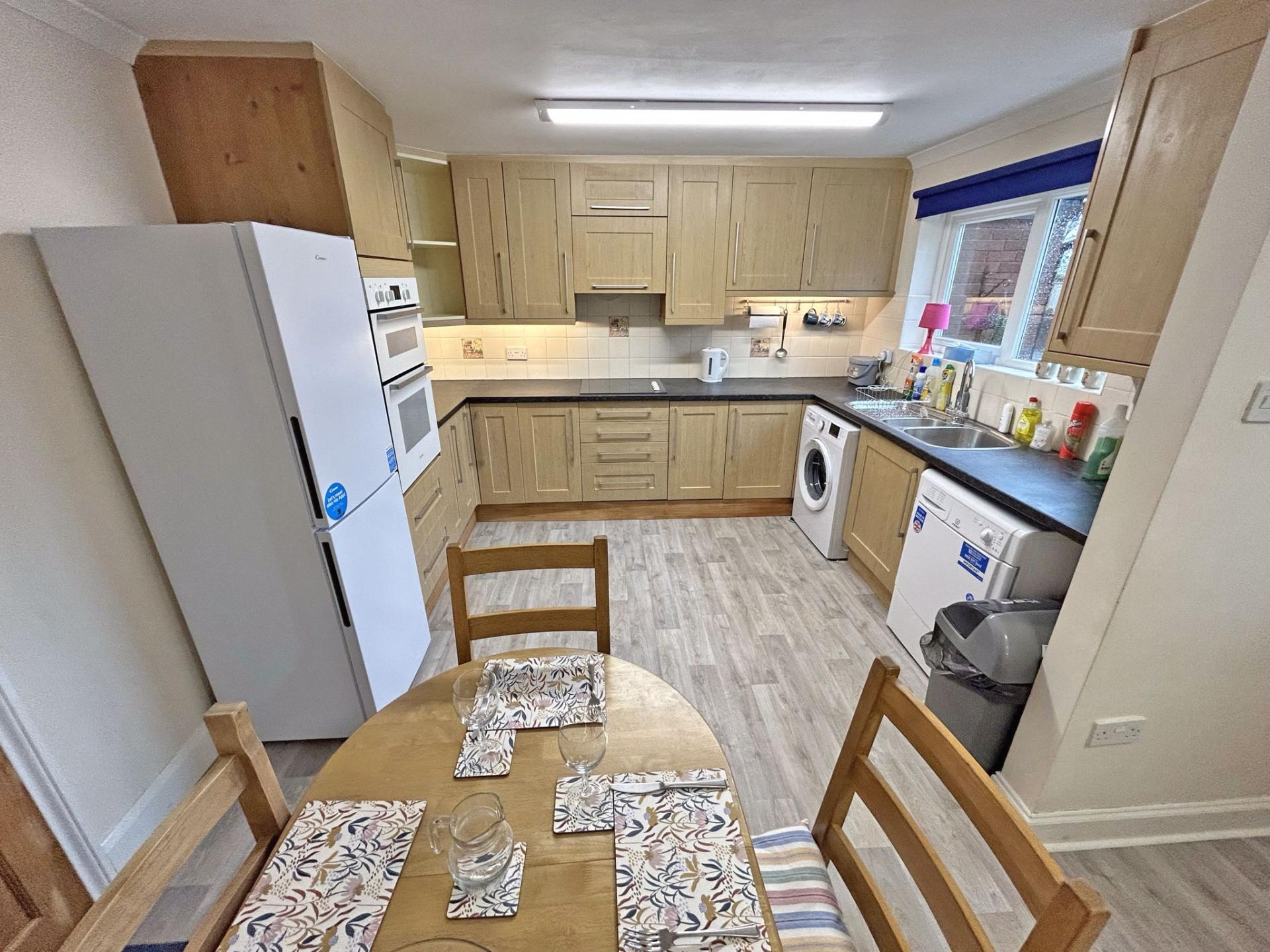 KITCHEN/BREAKFAST ROOM 4.80m (15’9) x 3.45m (11’4) uPVC window to the front aspect with fine views towards Bulverton Hill. A fitted kitchen comprising a range of floor standing and wall mounted cupboards with oak effect shaker style door and drawer fronts. Slate coloured worksurfaces. Tiled splashback. One and a half bowl stainless steel sink incorporating drainer. Electric double oven. Electric hob and cooker hood over. Freestanding fridge/freezer. Freestanding washing machine. Freestanding condenser dryer. Concealed gas fired system boiler. Central heating room stat. Fuse board. Telephone point. LED lighting. Lino wood effect floor covering. Radiator.