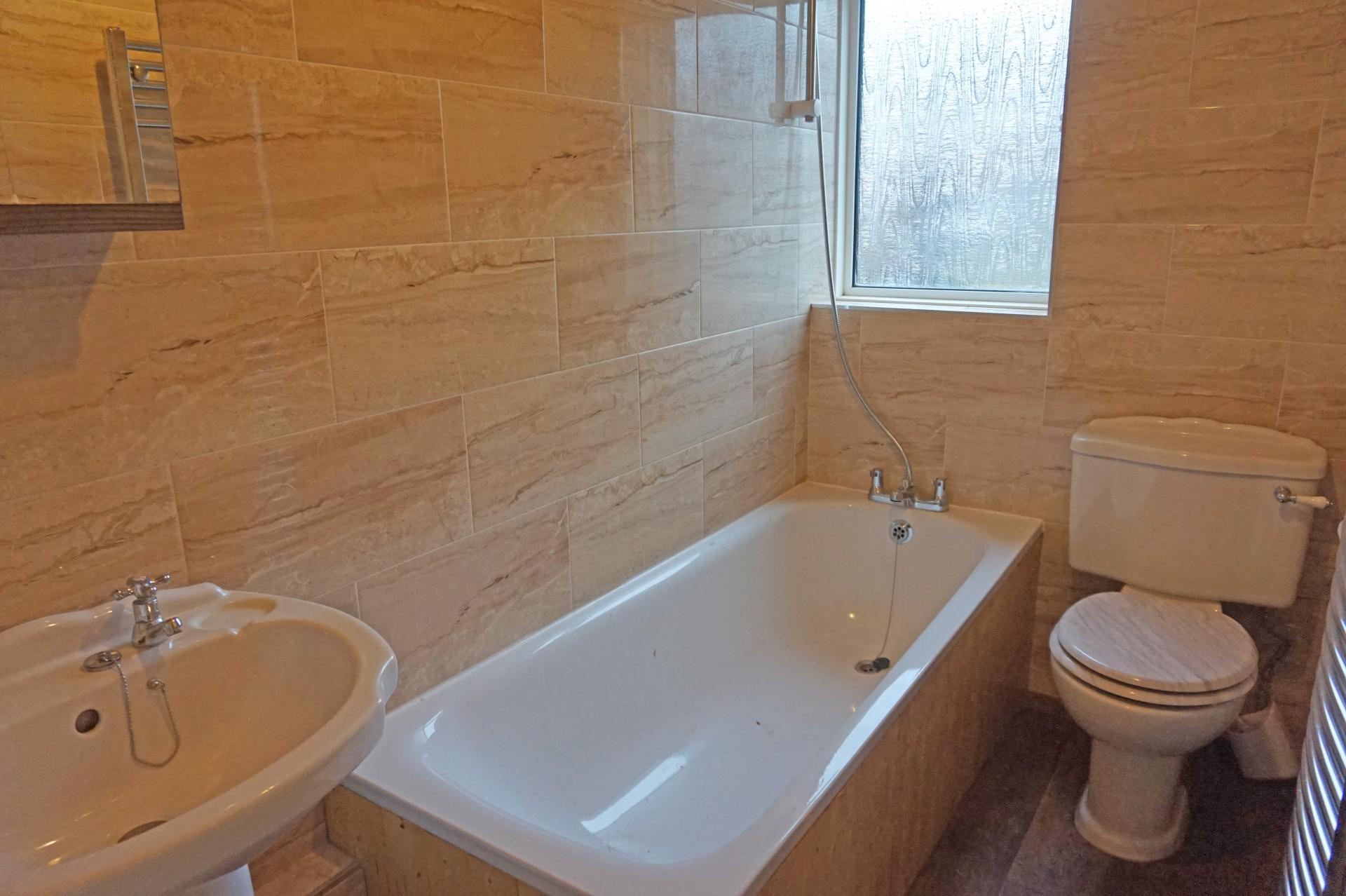 Obscure glazed uPVC window to front aspect with roller blind and newly fitted bathroom comprising of a white suite, WC, pedestal wash basin, panelled bath with bath/shower mixer tap, wall mounted shower riser rail and hand held shower rose. Shower curtain. Fully tiled walls from floor to ceiling. Wood effect lino floor covering. Heated chrome towel rail. Mirror fronted bathroom cabinet.