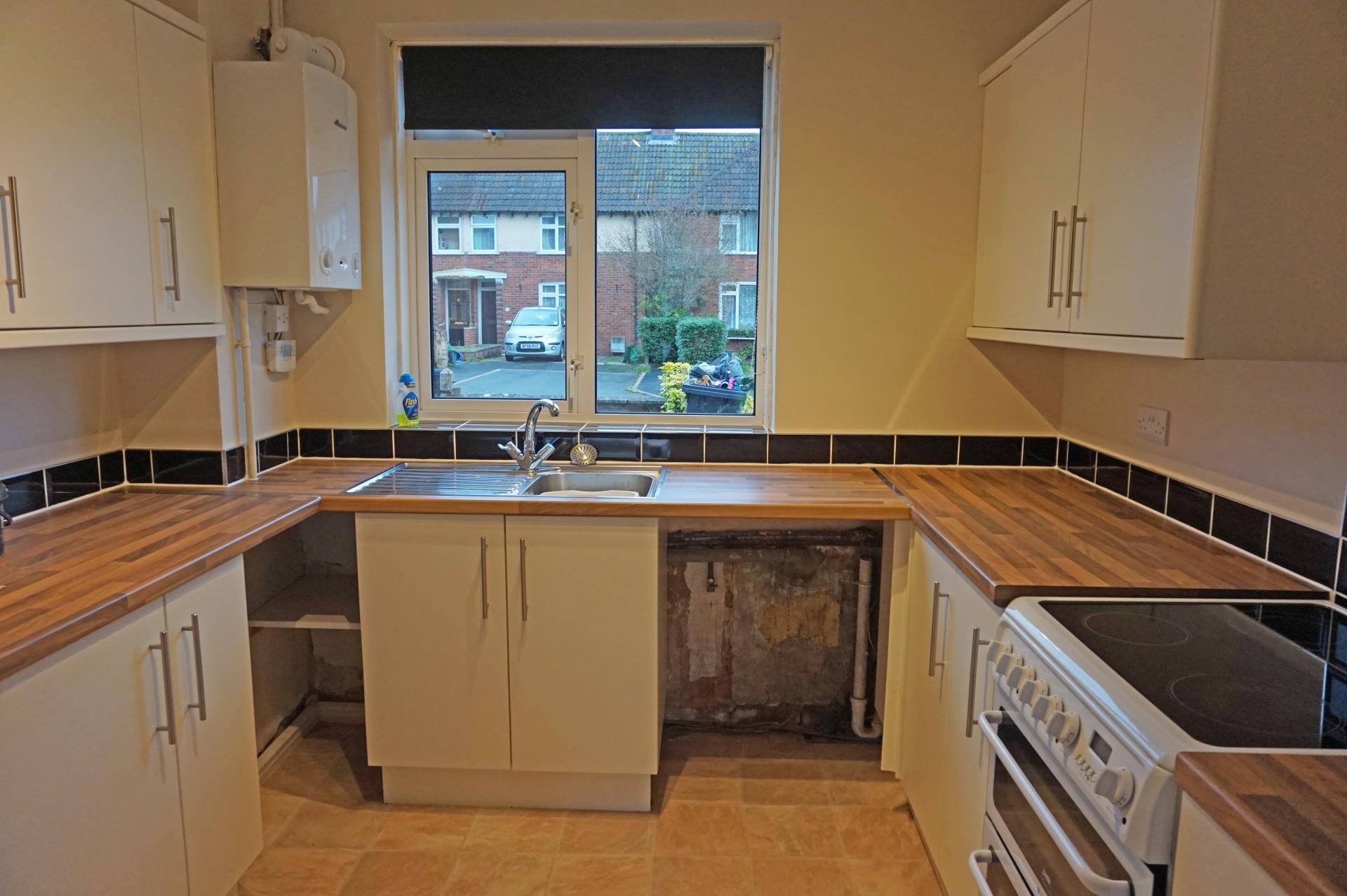 2.43m (7’11) x 2.74m (8’11) uPVC double glazed window with outlook to front aspect. Newly fitted kitchen comprising a range of floor standing and wall mounted cupboards with cream coloured drawer and door fronts, stainless steel handles, dark wooden butchers block wood effect worksurfaces with tiled upstand and splash backs. Stainless steel sink incorporating drainer with mixer tap. Space for a free standing fridge freezer. Space for undercounter washing machine or washer/dryer. Freestanding double electric cooker, incorporating electric hob. Tile effect lino floor covering. Worcester gas fired boiler for central heating and hot water with Honeywell central heating and hot water time clock and programmer. Ceiling light with directional low voltage down lights.