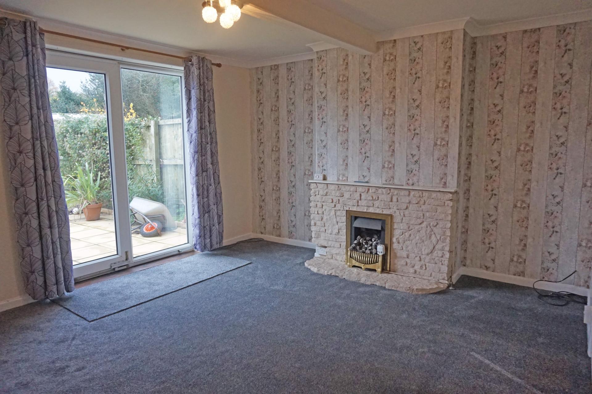 4.28m (14’) maximum measurement into chimney alcove x 3.94m (12’11) Coved ceiling. uPVC double glazed sliding patio door with outlook to rear garden and enjoying a southerly aspect. Fireplace with stone hearth. Painted brick mantle piece with timber shelf. Brass framed inset gas fire. Sky television connection. TV connection. Radiator. Carpet. Door to: