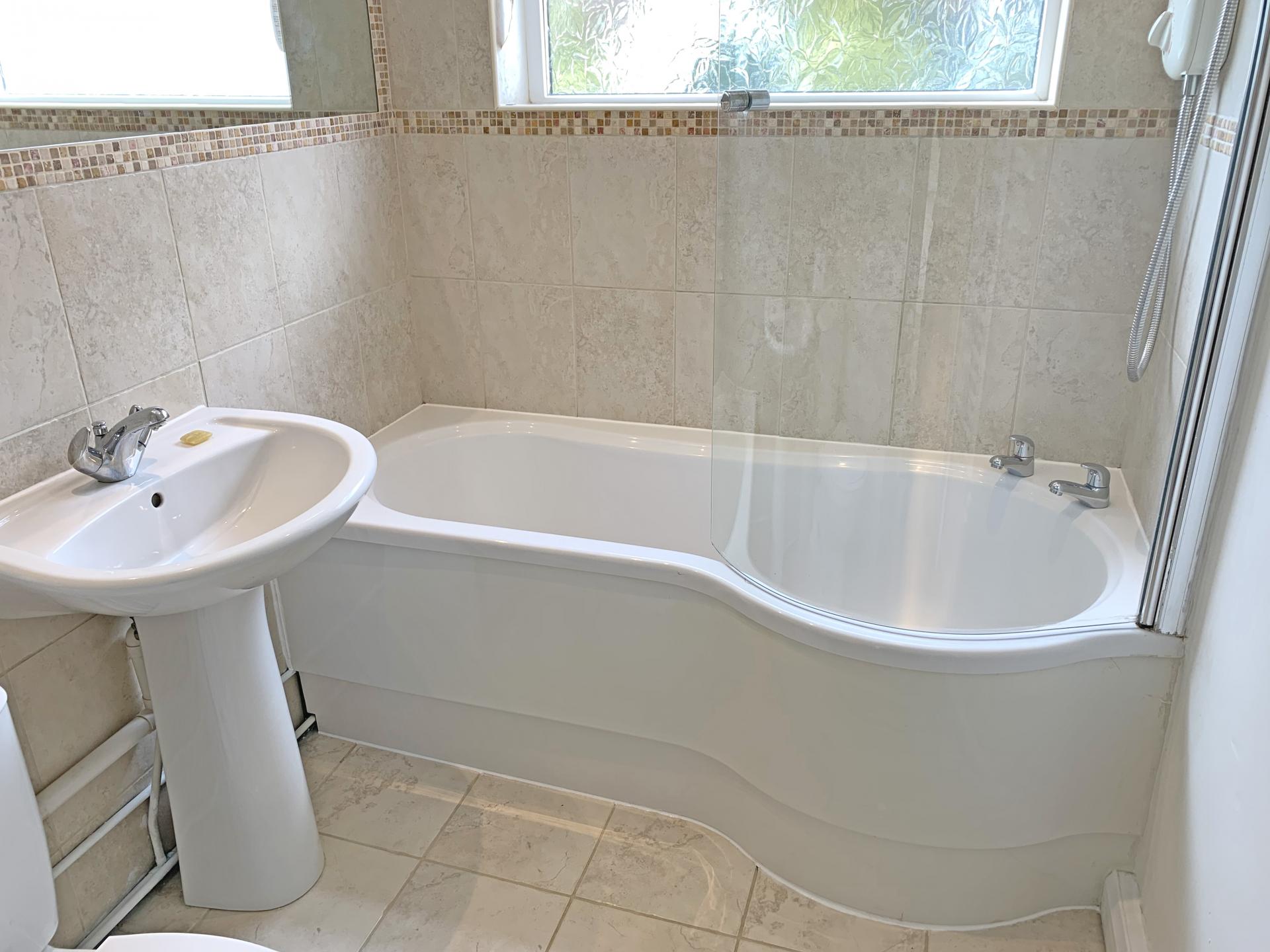 A modern white suite comprising a close coupled WC, Pedestal wash basin, ‘P’ shaped bath with curved shower screen. Fully tiled walls over. Mira electric shower with shower rose and wall mounted riser rail. Obscure glazed uPVC window with roller blind. Tiled floor covering. Large wall mounted mirror. Shaver point. LED down lights and heated towel rail.