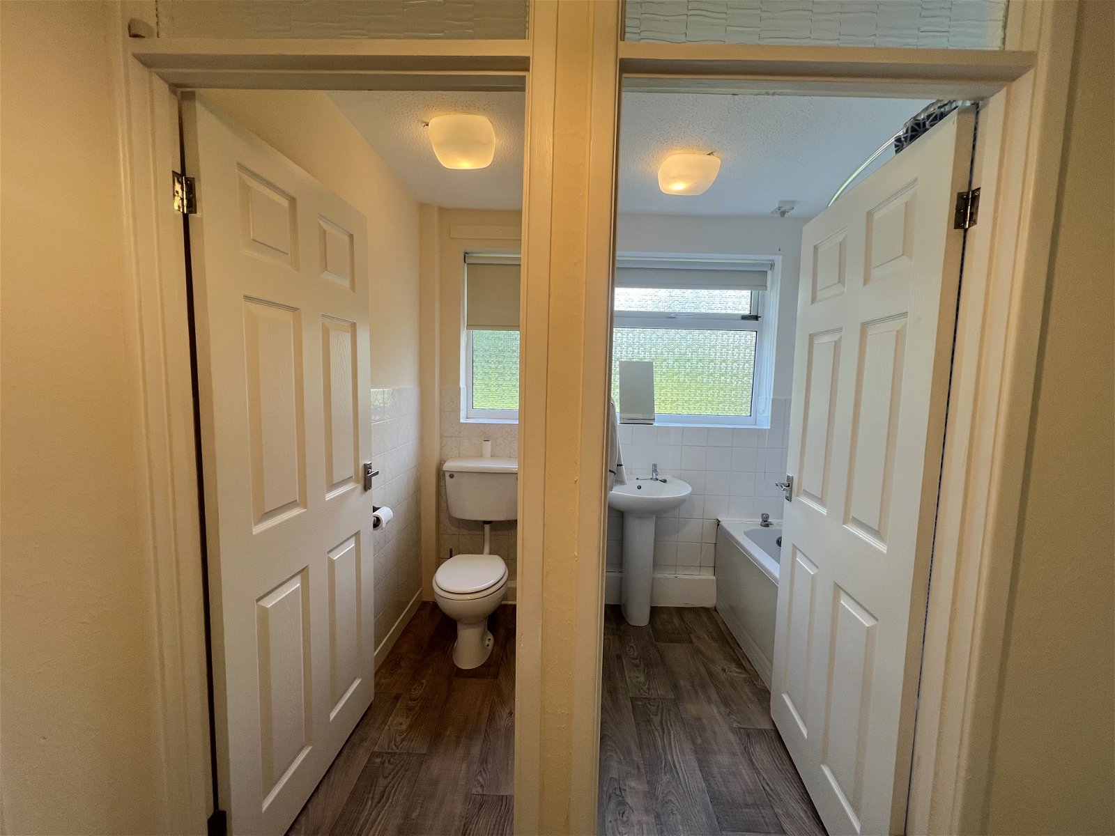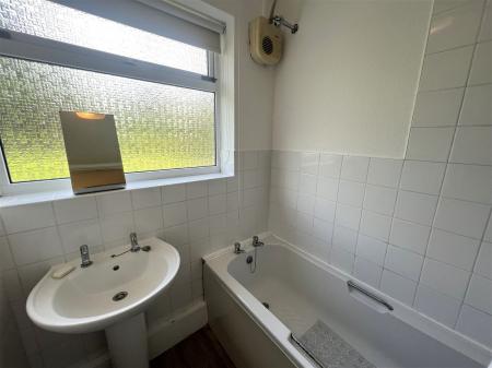 Featuring a panelled bath with an electric shower over and a pedestal wash hand basin. The room has partial tiling to the walls, a rear facing obscure double glazed window and a central heating radiator.