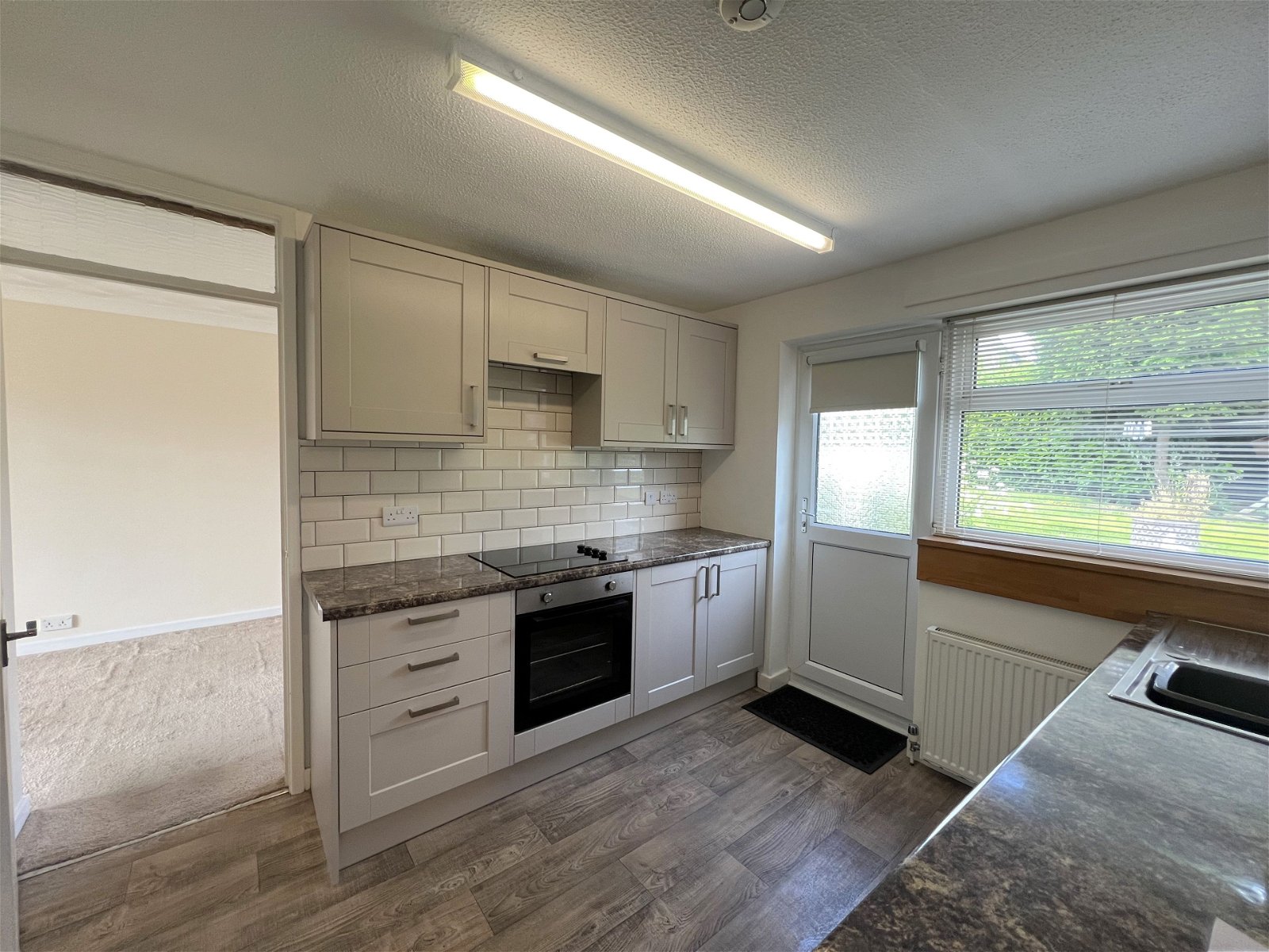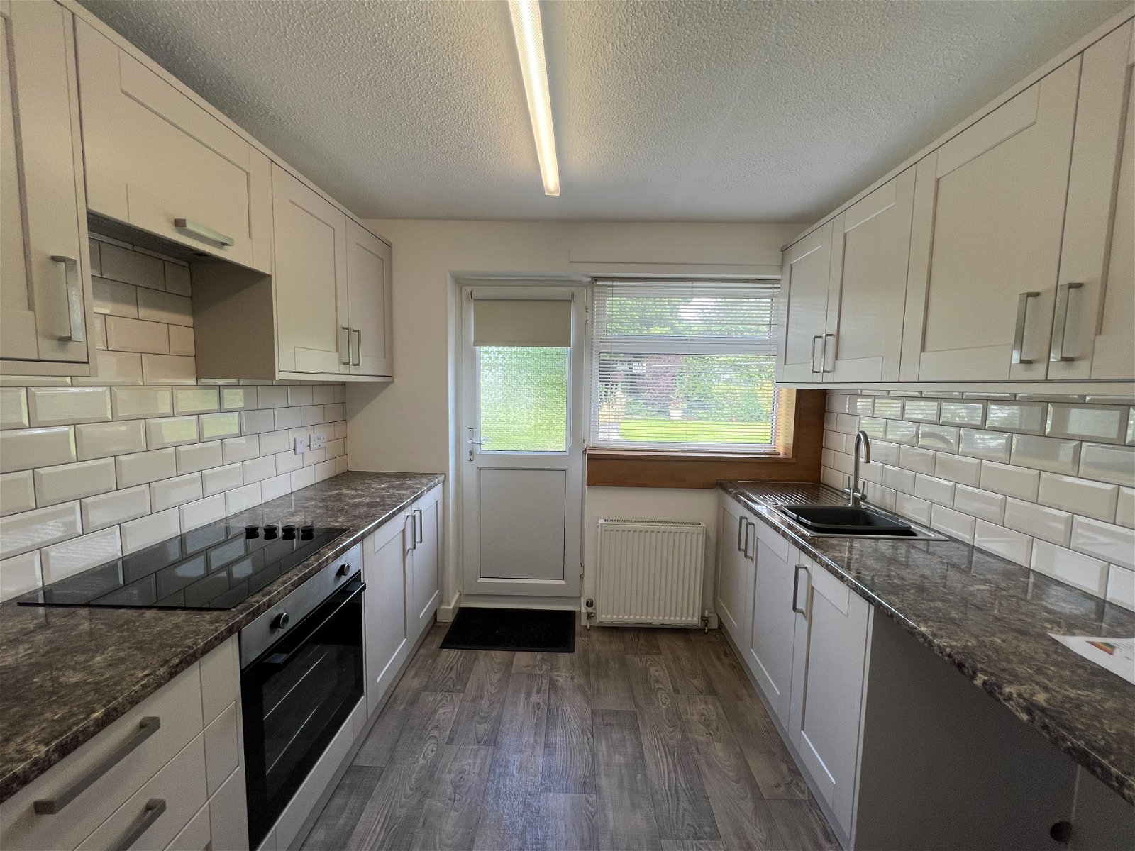 A modern kitchen featuring a range of grey wall and base units, with a complimentary roll edge work surface which in turn incorporates a Stainless steel sink and drainer unit with a mixer tap over. Appliances include a four ring electric hob, with an electric oven beneath and an extractor unit over. There is partial tiling to the walls, under counter plumbing for an automatic washing machine and space for a fridge freezer. The room has a rear facing double glazed window and a Upvc entrance door opens onto the rear garden.