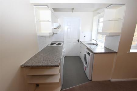 Kitchen - Georgian style window to side, range of matching wall and base units with roll top work surfaces, further display shelving, 4 ring electric hob set into work surface with oven under and extractor over, space for fridge, space and plumbing for washing machine door to rear lobby