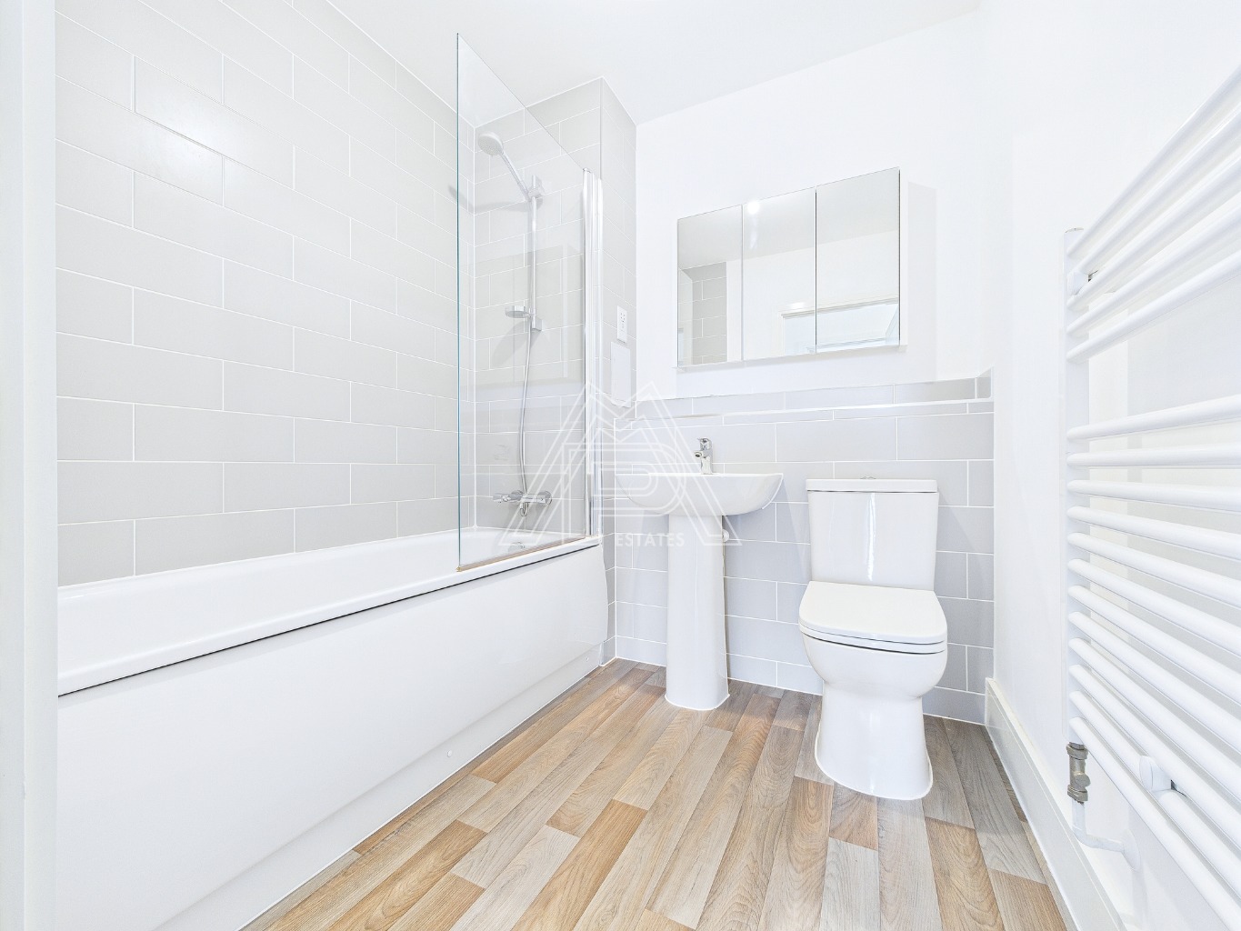 The bedroom is generously sized and includes built-in storage, while the stylish bathroom features a modern white suite with a shower over bath.