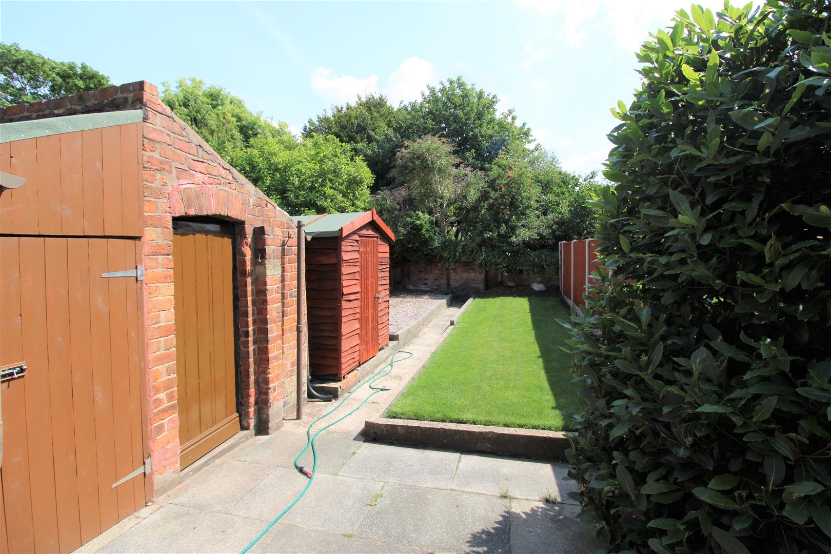 Rear Exterior - Paved patio, lawn area and planted boarders, shed and outhouses.