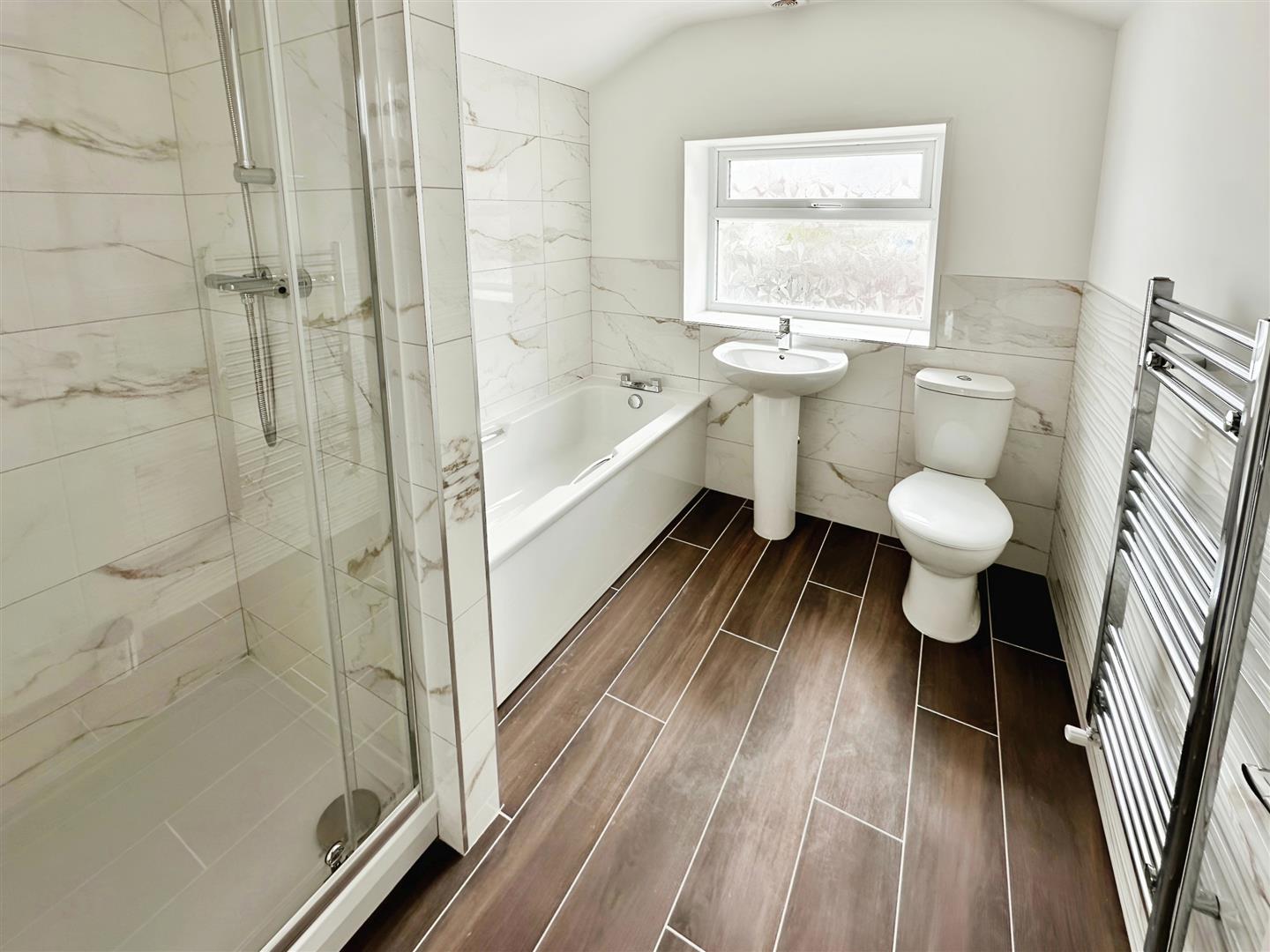 Bathroom - Part tiled walls and tiled flooring, walk in shower cubical with mixer shower, panelled bath, sink and low level w.c. chrome ladder towel rail and double glazed windows