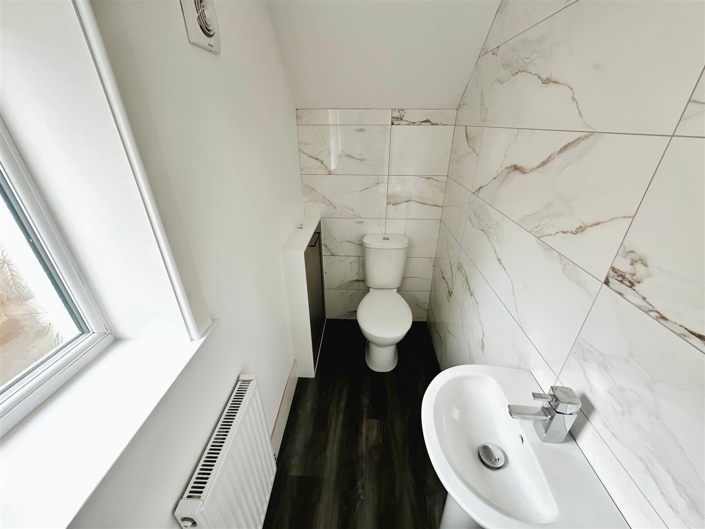 Downstairs W.C - Double glazed window, laminate flooring, part tiled walls, radiator, low level w.c. sink with mixer taps