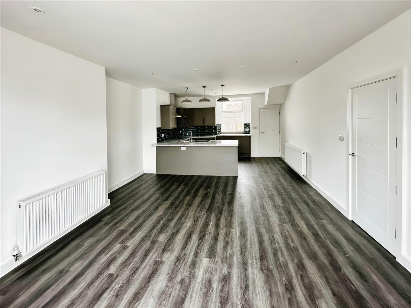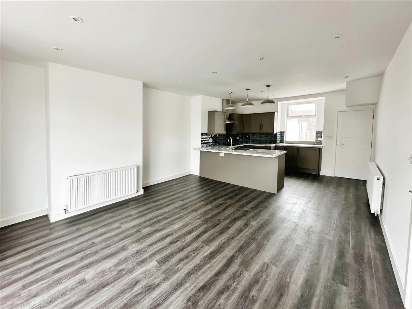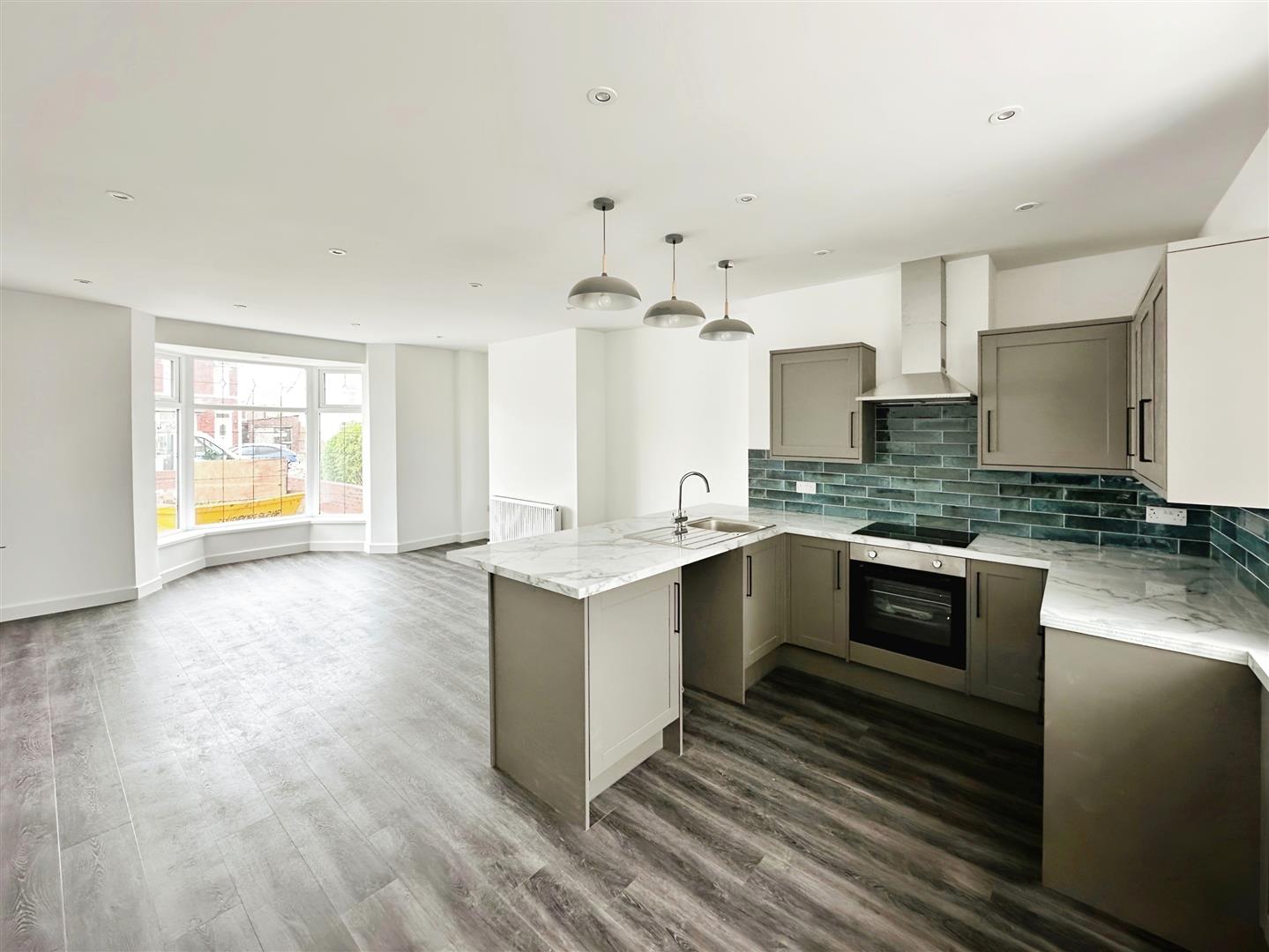 Open Plan Lounge / Kitchen - Double glaze bay window to the front and 1 x double glazed window to rear, Laminate wood flooring, radiators, tv points, kitchen comprises of a range of fitted base and wall units with a stainless steel single drainer sink with mixer tap, plumbing for dishwasher/ washing machine, electric hob, electric oven integrated and extractor hood, part tiled walls around surfaces.