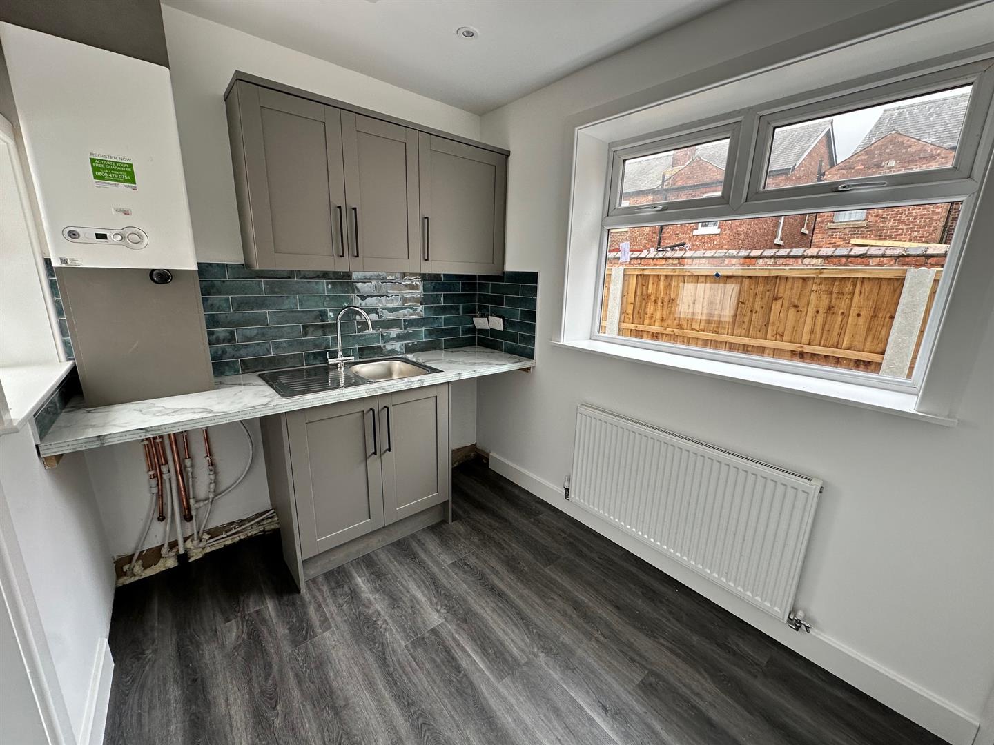 Utility Room - Double glazed window, PVC double glazed exterior door, laminate flooring, radiator combi boiler, part tiled wall range of fitted base and wall units with a stainless steel single drainer sink and mixer tap. Plumbing for washing machine