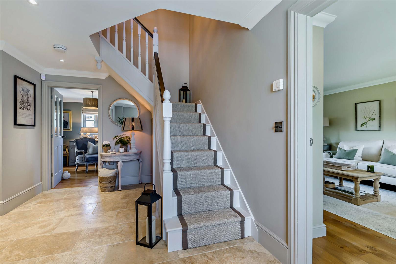 Upstairs, the property boasts four beautifully finished bedrooms. The master bedroom is both elegant and inviting, with plenty of built-in storage and a large window that allows for natural light to pour in. Three of the bedrooms benefit from their own en-suite bathrooms, all finished to a high standard with quality fittings, while a well-appointed family bathroom serves the remaining room. Characterful features such as panelling and slanted ceilings are found throughout the upper floor, adding charm and individuality to each room. One of the bedrooms is currently arranged as a twin room, making it ideal for guests or children.