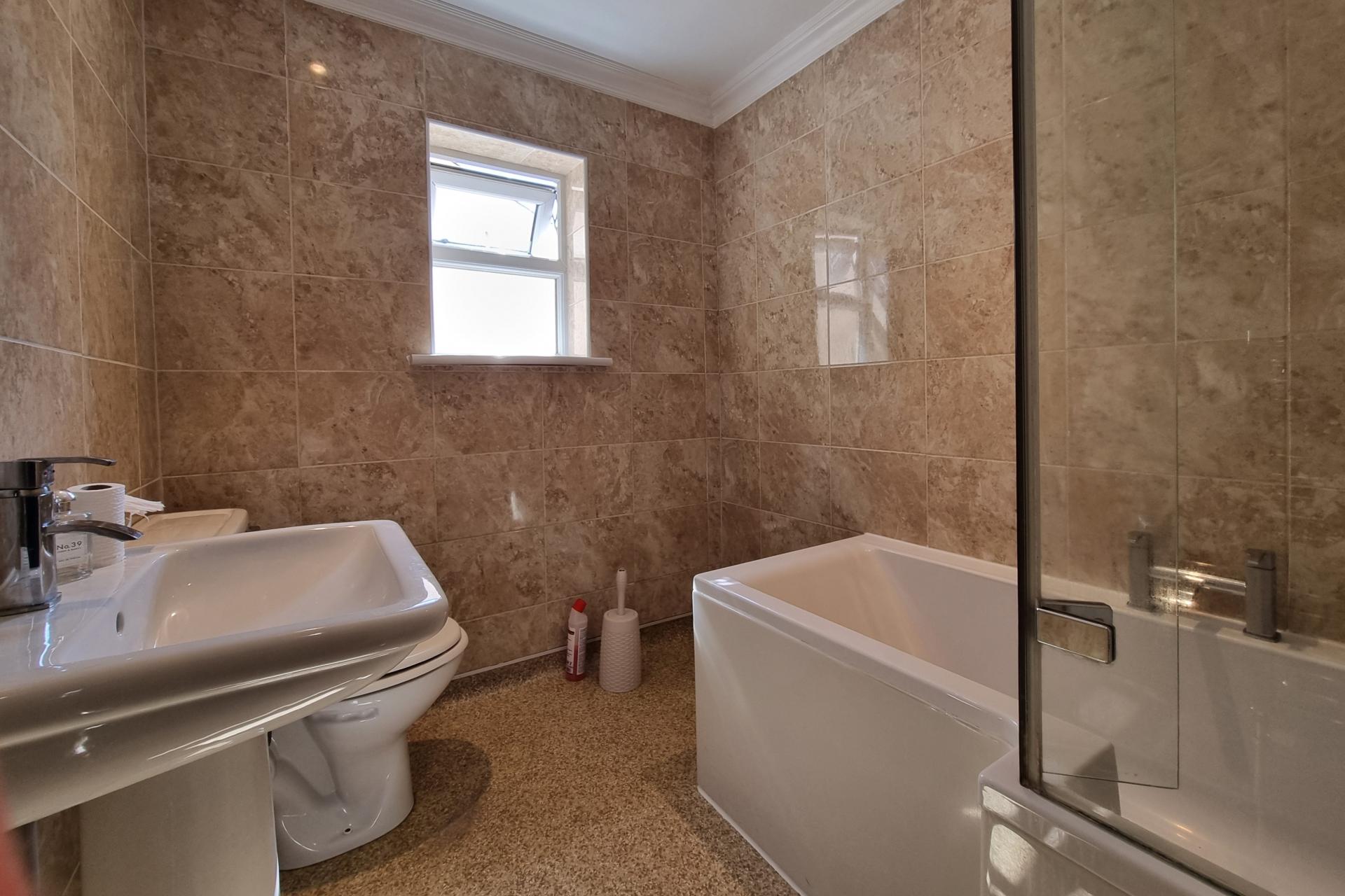BATHROOM White suite comprising: P shaped panelled bath with shower and screen over, low level w.c., pedestal wash hand basin, chrome heated towel rail, double glazed frosted window to side aspect, fully ceramic tiled to walls.