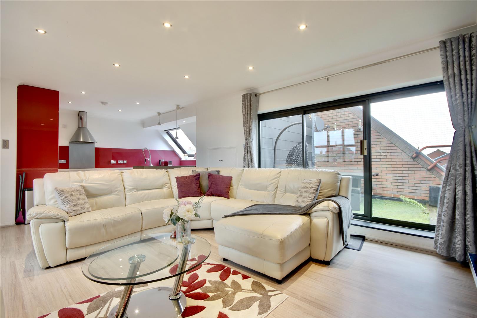Internally, the apartment is comprised of a large, open plan kitchen/lounge/diner, which is flooded with natural light from the dual aspect windows. The lounge area also includes sliding doors onto the spacious balcony.