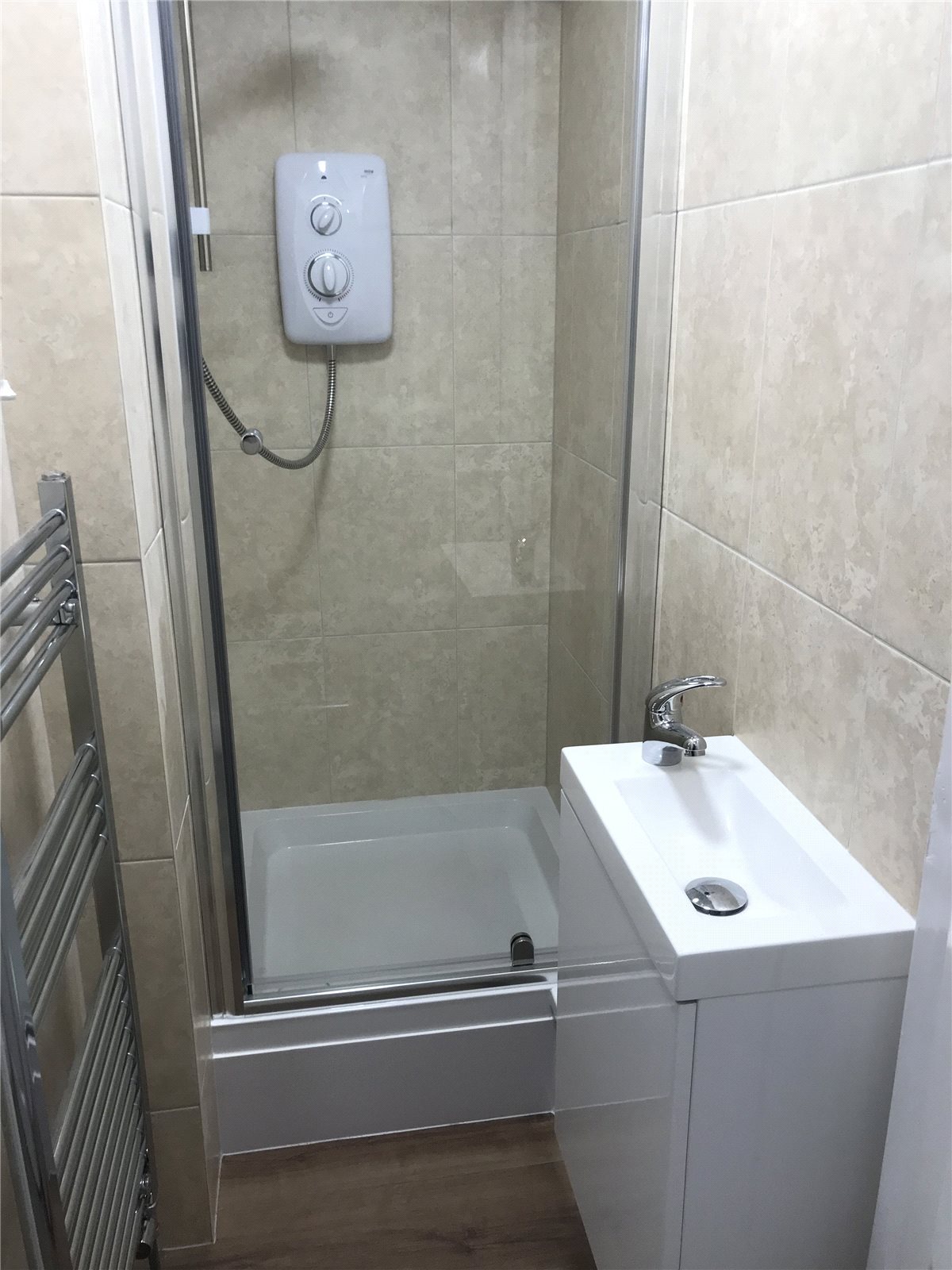Shower cubicle, basin, towel rail, separate WC and wash basin.