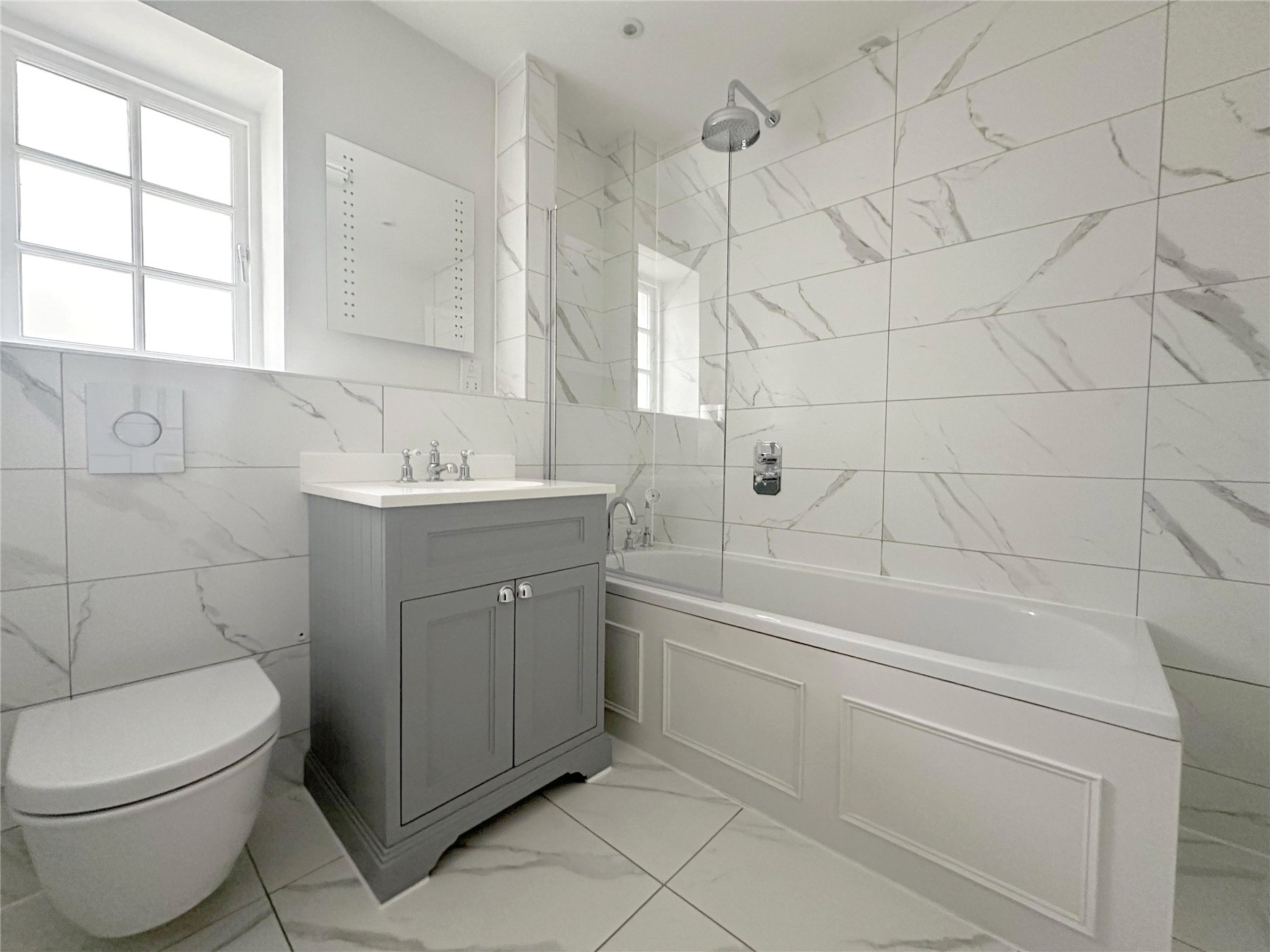 BATHROOM 7'4" x 7'7" (2.24m x 2.3m). Low level WC, wash hand basin with vanity underneath and shower over bath. Obscured double glazed window and radiator and underfloor heating.