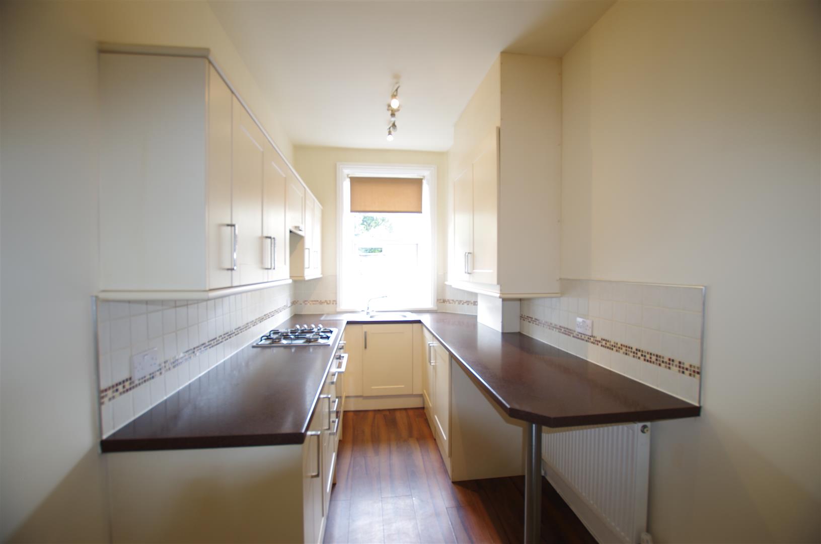 Kitchen - 4.544 x 2.035 (14'10" x 6'8") - Modern fitted kitchen with a range of wall and base units. Stainless steel single bowl sink. Tiled splashback. Electric oven. Gas hob. Extractor fan. Plumbing for washing machine. Cupboard housing boiler. Laminate floor. Radiator. Access to cellar. UPVC double glazed door to side. UPVC double glazed window to front elevation.