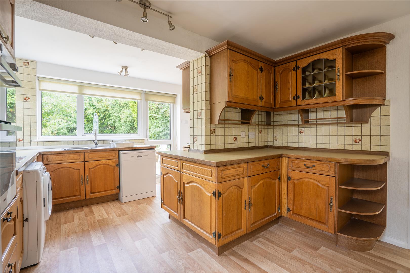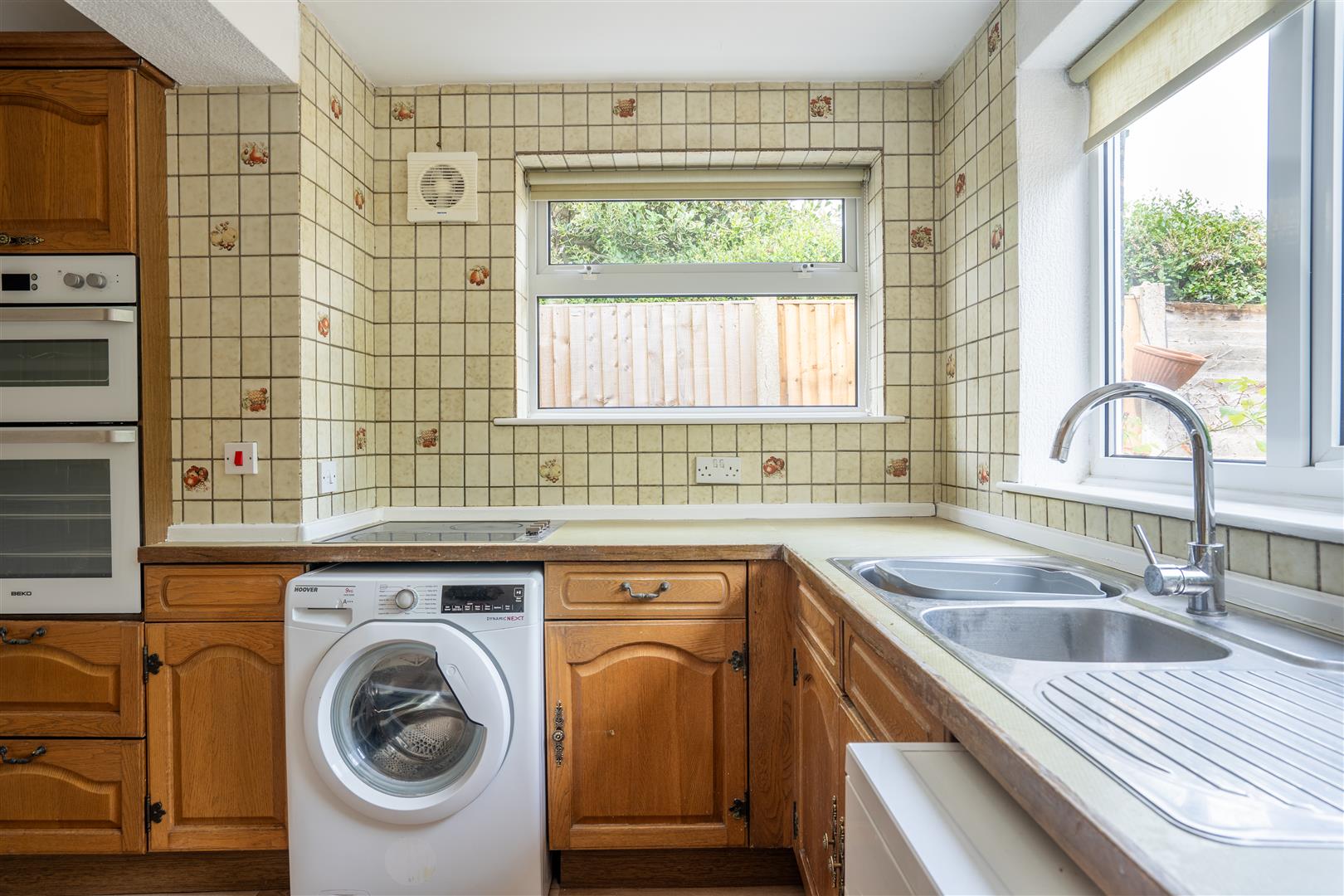 Kitchen - Two double glazed windows, work top surfaces, fitted wall and base units, built in double oven and ceramic hob, tiled walls, wood effect vinyl flooring, extractor fan, built in cupboard with wall mounted 'Alpha' gas fired boiler serving central heating and hot water, opaque double glazed door to side.