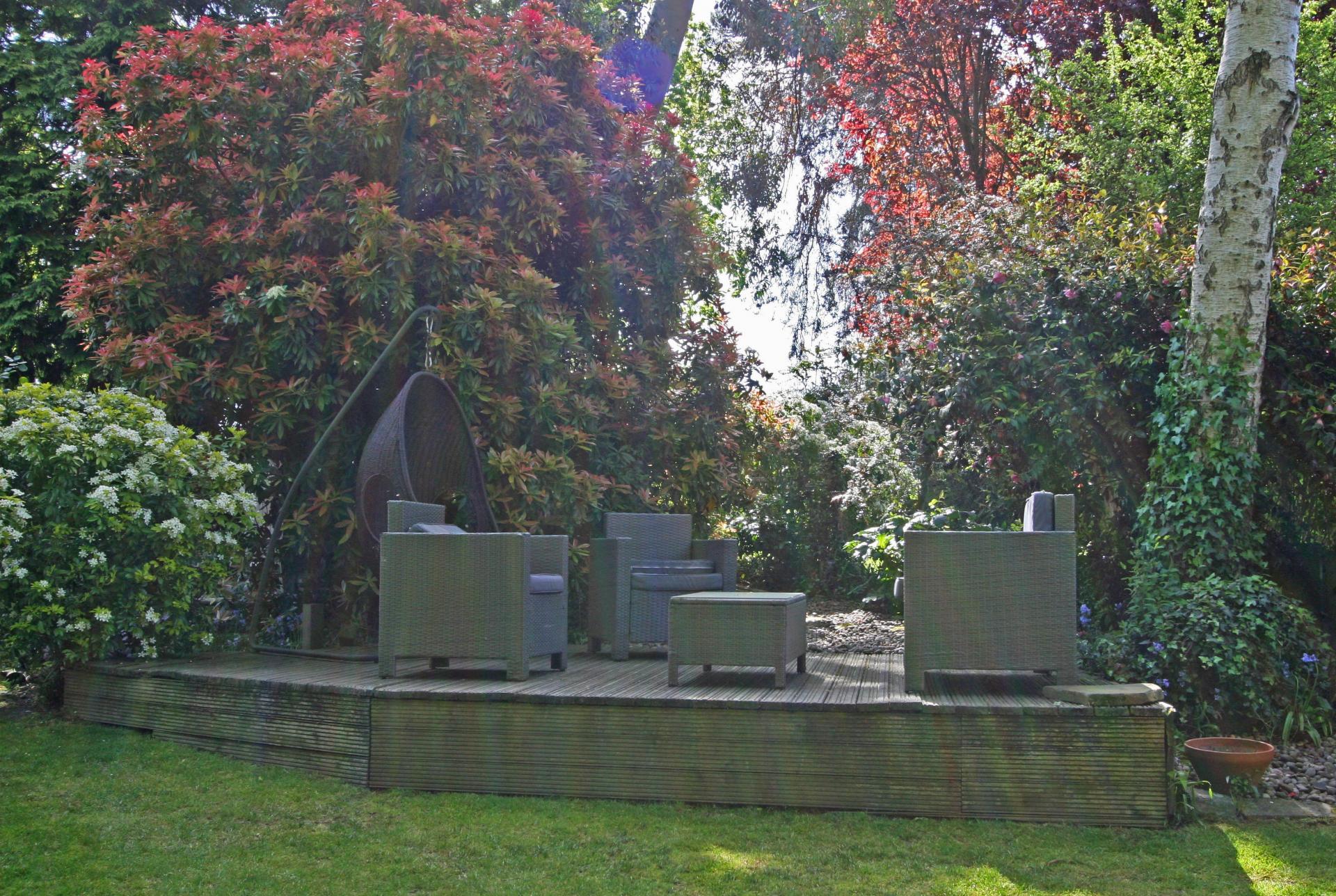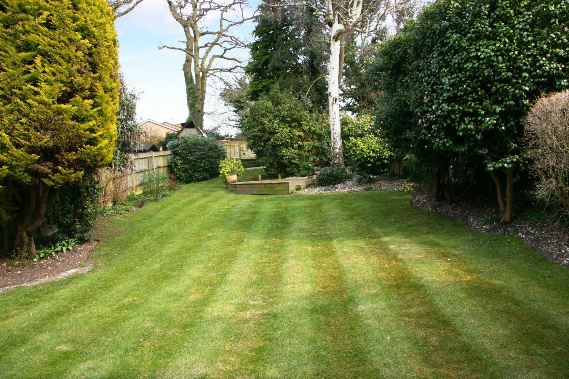 Large and attractive rear garden laid to lawn with mature trees and shrubs. Decking area & Shed. Gardener included.