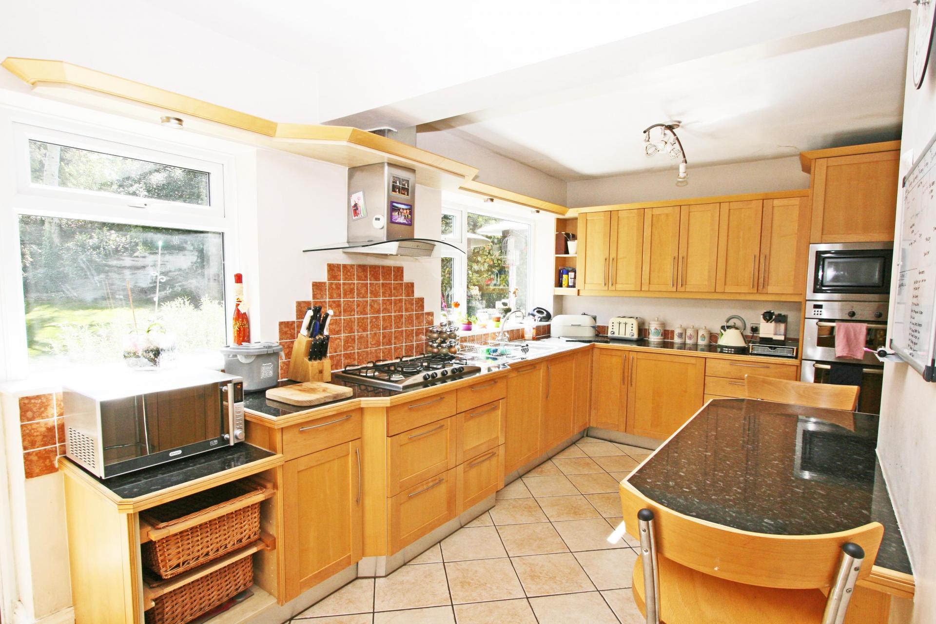 Kitchen 19’ x 11’ (at the widest point) (5.7 X 3.3) fully fitted with floor and wall units incorporating gas hob, double oven, microwave, fridge freezer, dishwasher and washing machine. Door to back garden.