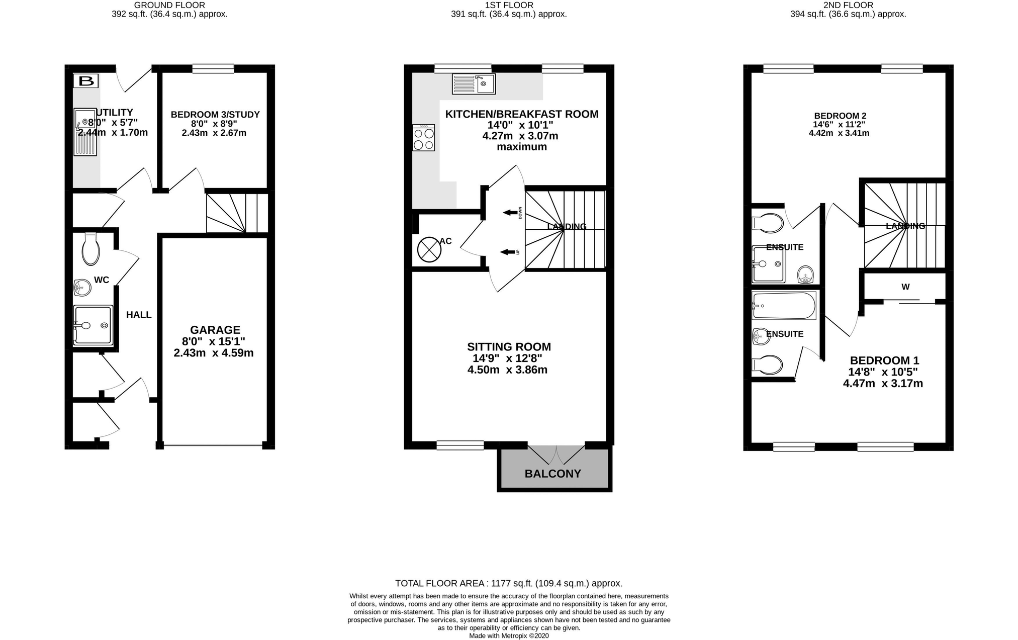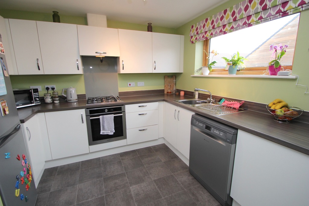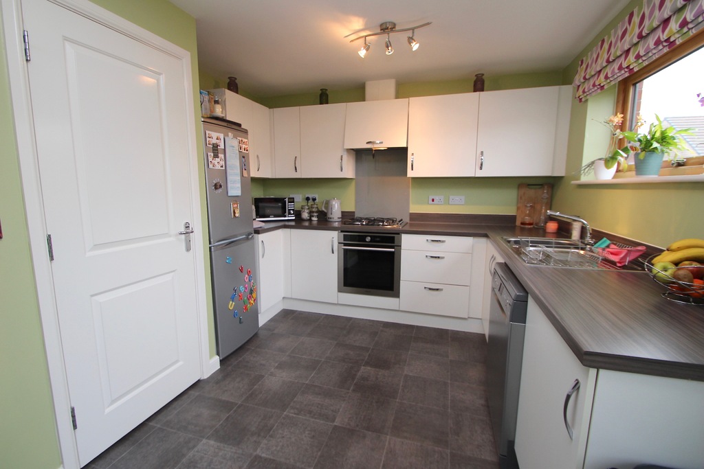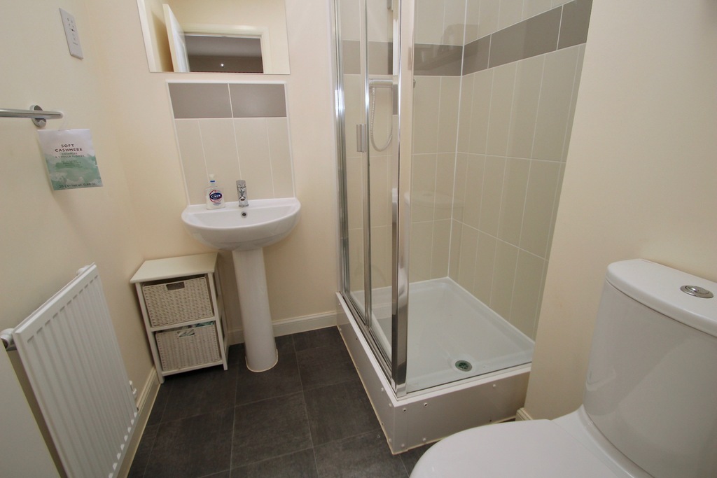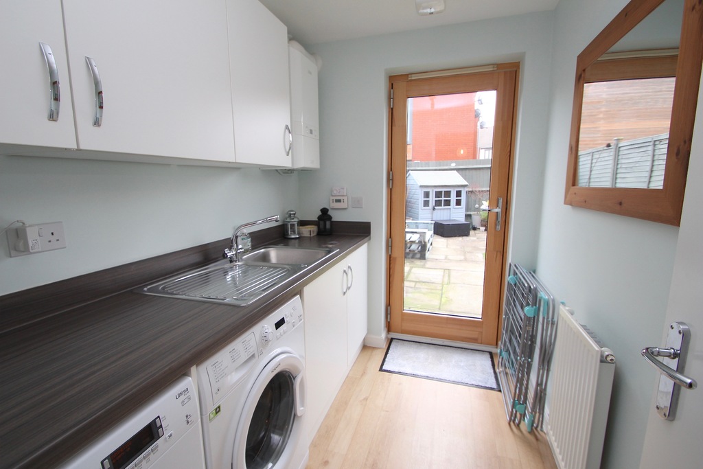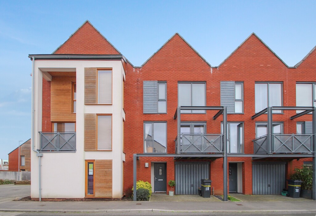 A very desirable town house of contemporary design providing stylish accommodation and enjoying a popular location on this award winning development. The main entrance is accessed from the front elevation via a storm porch with adjacent outside store and in turn opens to the entrance hall. From here doors open off to a downstairs shower room, utility room and third bedroom/reception room. The utility room is fitted with high gloss units and walnut effect work tops with space for a washing machine and tumble dryer. On the first floor landing there is a large airing cupboard with shelves. The lounge is well-proportioned with doors opening out onto a balcony. The stylishly appointed kitchen/diner provides great cooking and dining space having room for table and chairs at one end. The kitchen has been fitted with a range of high gloss base, wall and drawer units, walnut effect worktop surfaces and a built-in hob, oven and cooker hood. On the second floor both the master bedroom and second double bedroom each have adjoining en-suites. The rear garden has been landscaped tastefully and is low maintenance. Integated garage to front. Available now. Deposit equivalent to 5 weeks' rent.