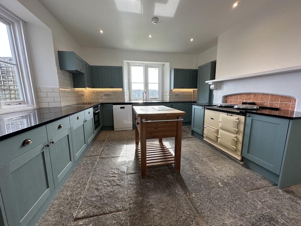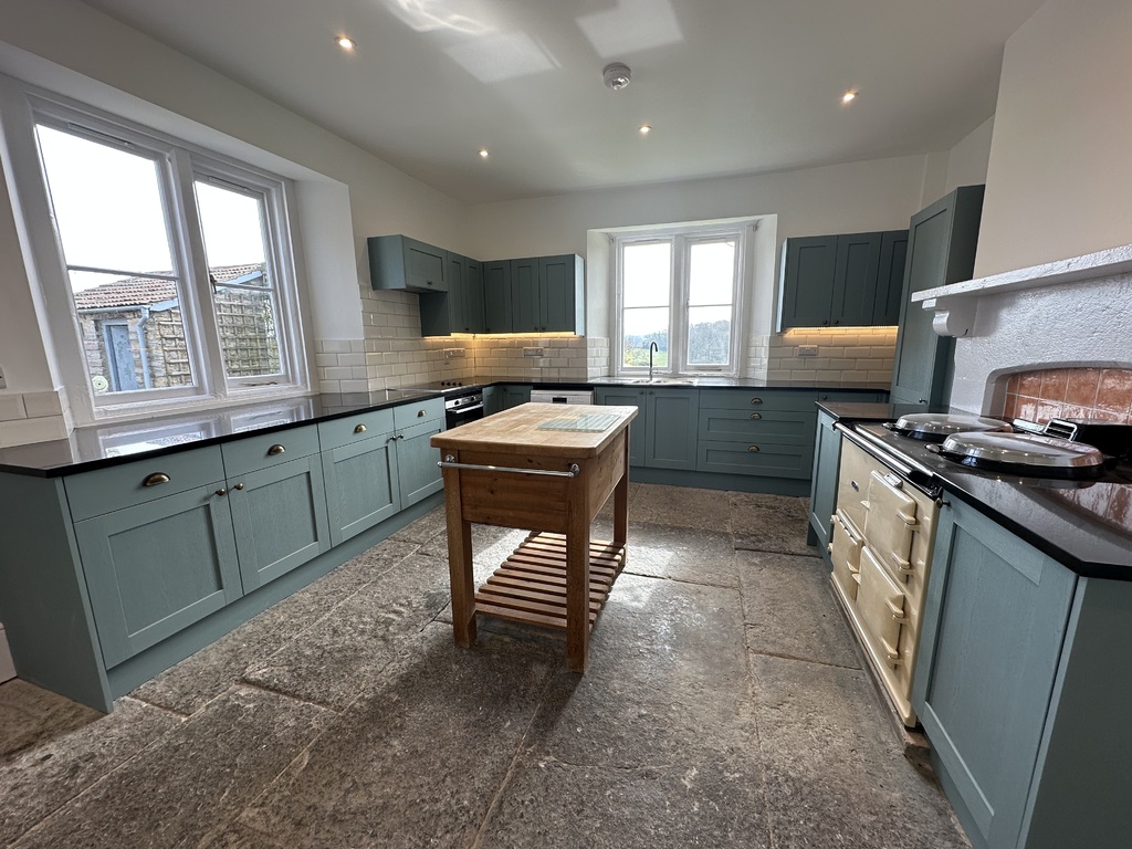 An impressive and superbly presented period property built from Blue Lias stone, situated in an envious hilltop position affording far reaching views over the surrounding rolling countryside. This beautiful old farmhouse boasts many original period features, as well as numerous reception rooms to the downstairs; two with log burners, and two further reception rooms with period flag stone flooring. The stylish newly fitted island kitchen comes complete with some appliances, and offers a range of wall and base units. To the upstairs is located the large family bathroom and five generous bedrooms, the spacious master bedroom benefitting from a large en suite with separate bath and shower enclosure. To the outside, the property offers extensive, mature gardens, ranging from wild areas, manicured lawns, flowers beds, and mature trees and shrubs. To the front of the property is found the large driveway with its own turning circle and detached garage with parking for multiple vehicles. Available now. Deposit equivalent to 5 weeks rent.