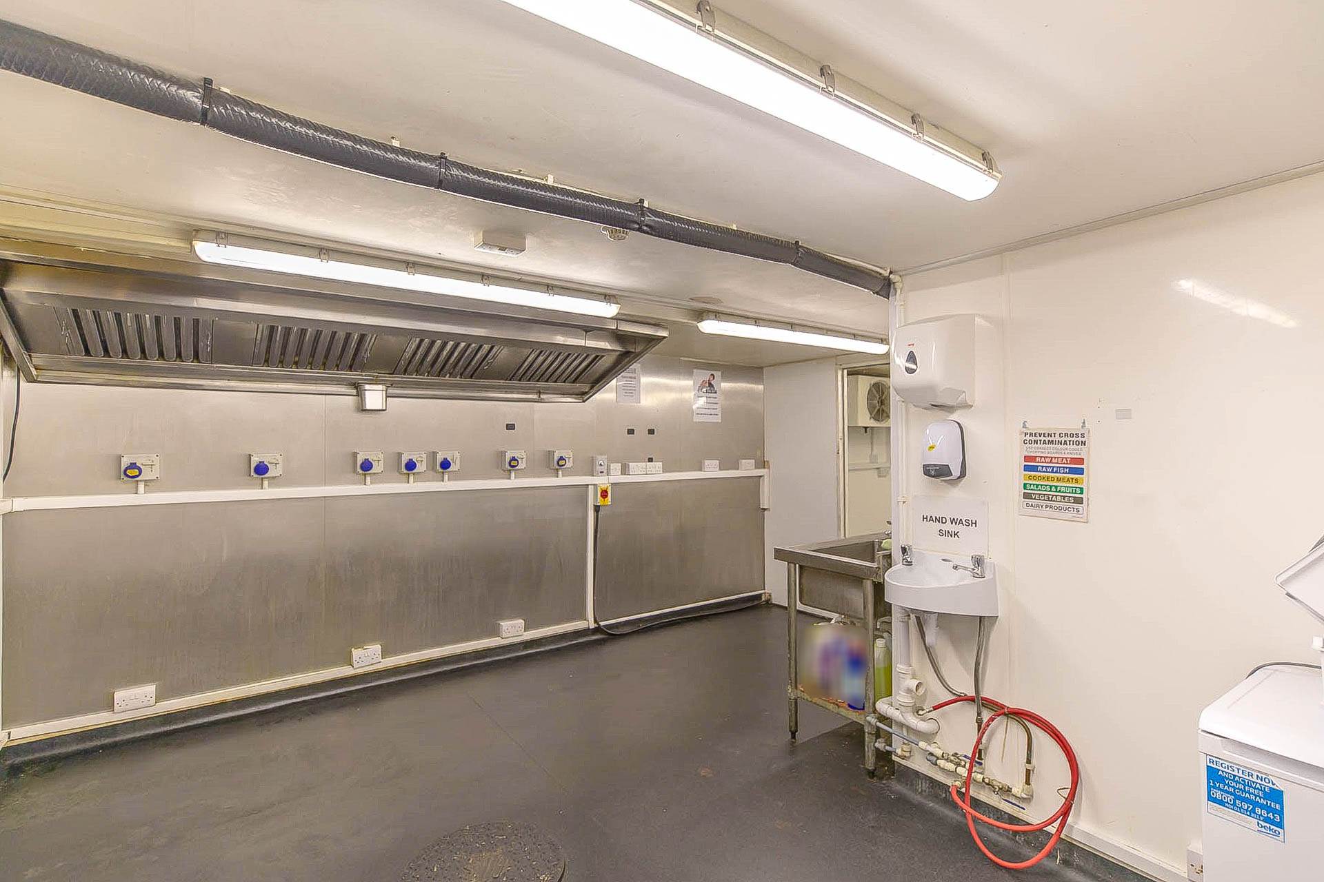 Lighting, commercial extractors, twin sink unit, hand wash basin, space for appliances and cookers. Opening to further storage with spaces for friddge and freezers.