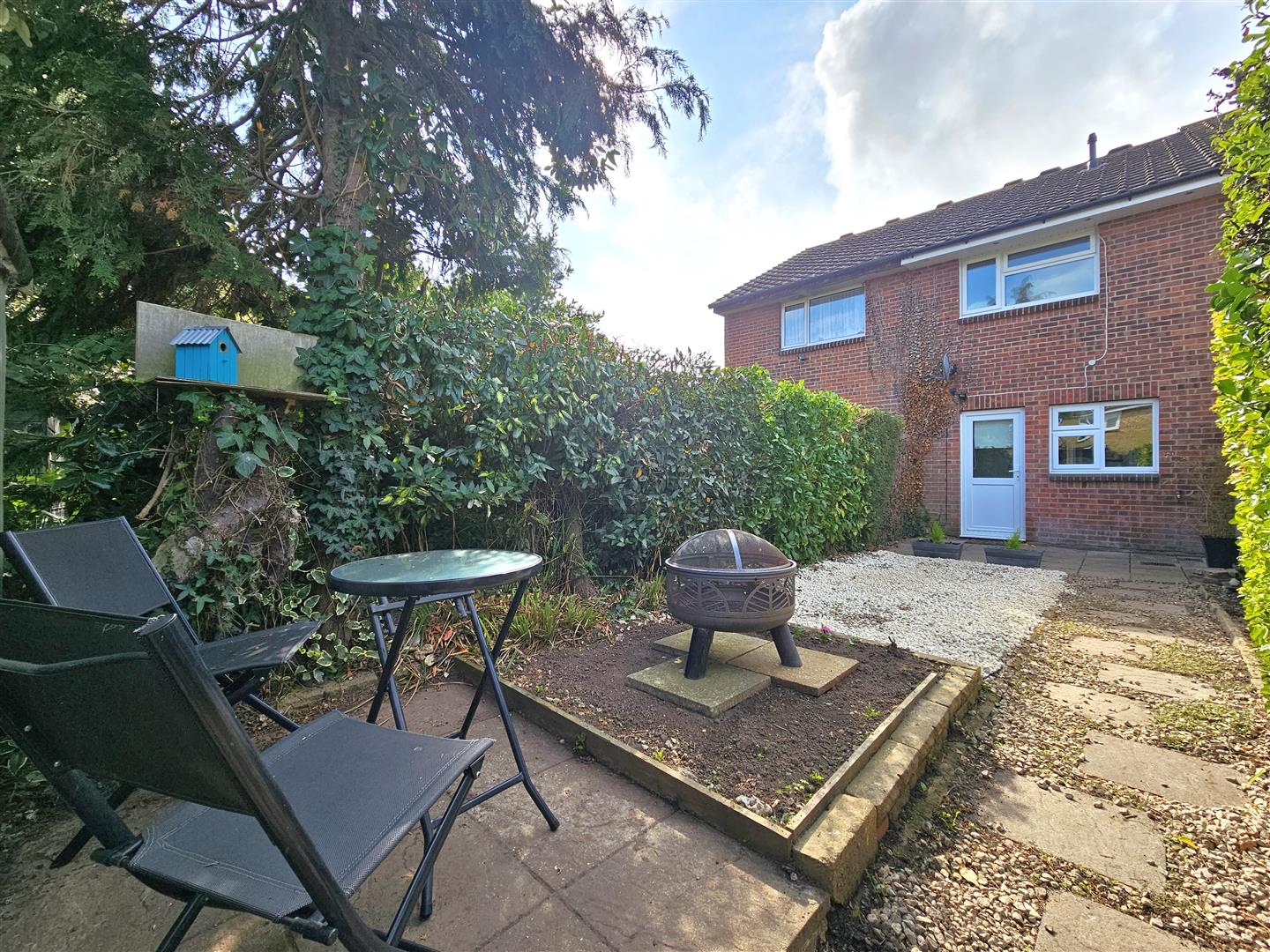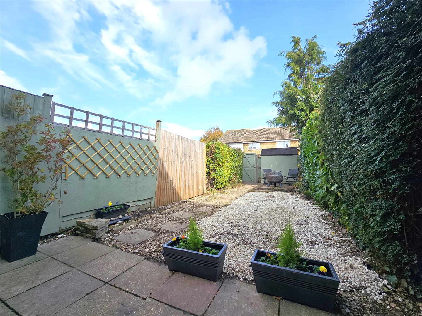 Rear enclosed low maintenance garden majority laid to paved patio, shingled areas, mature shrubbery & rear access