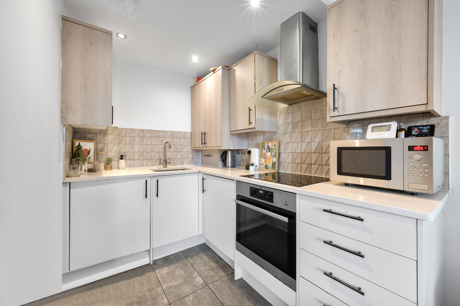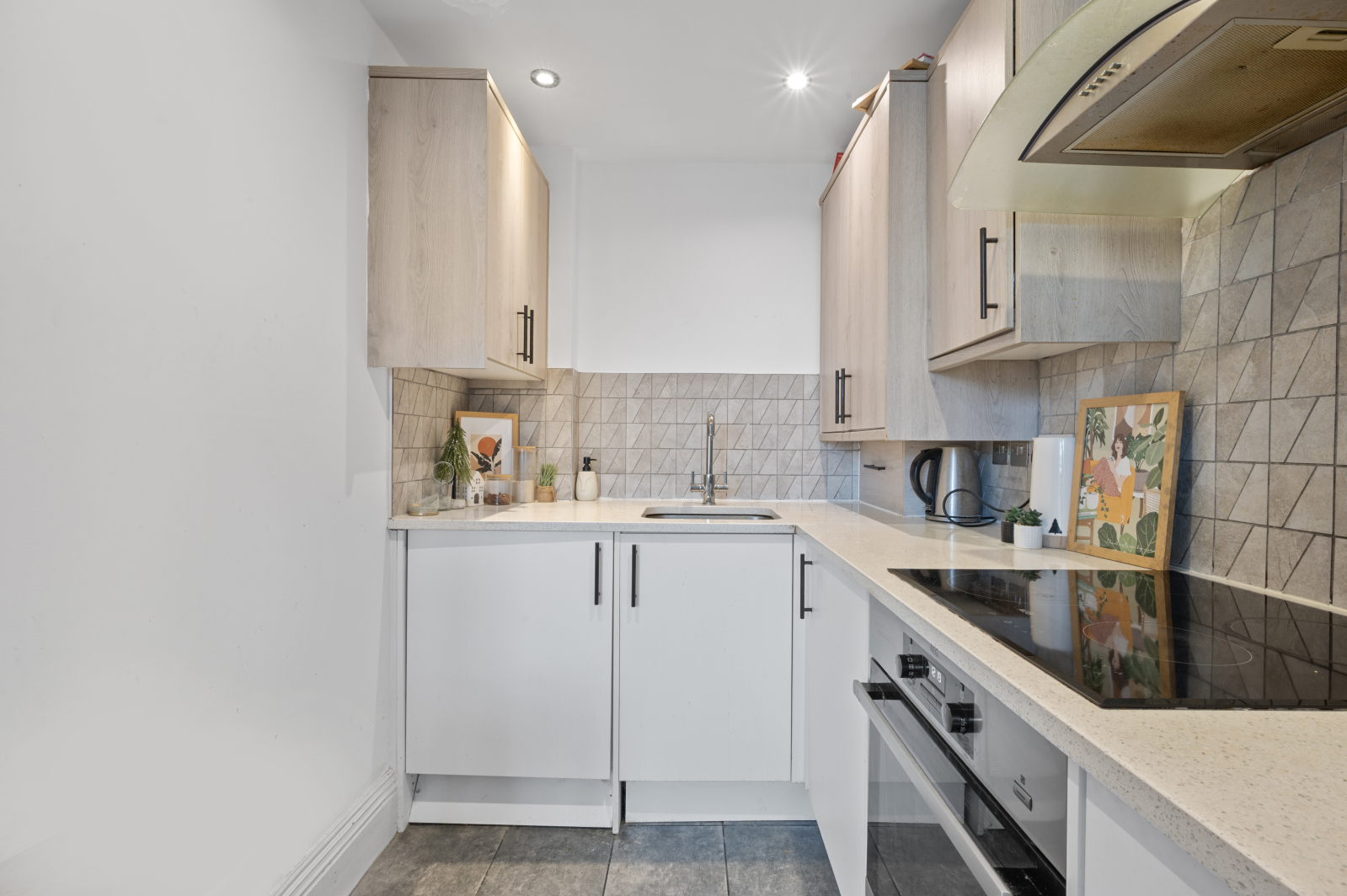 The studio offers a large main room with box bay windows flooding the room with natural light. Open plan to a modern fitted kitchen with appliances to include under counter fridge, washing machine, oven with hob and microwave.
