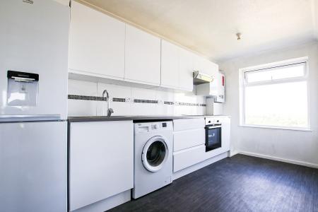 13' 7" x 6' 6" (4.14m x 1.98m) Modern fully fitted kitchen with electric hob, electric double oven, integrated under counter fridge, Beko washing machine and double glazed window.