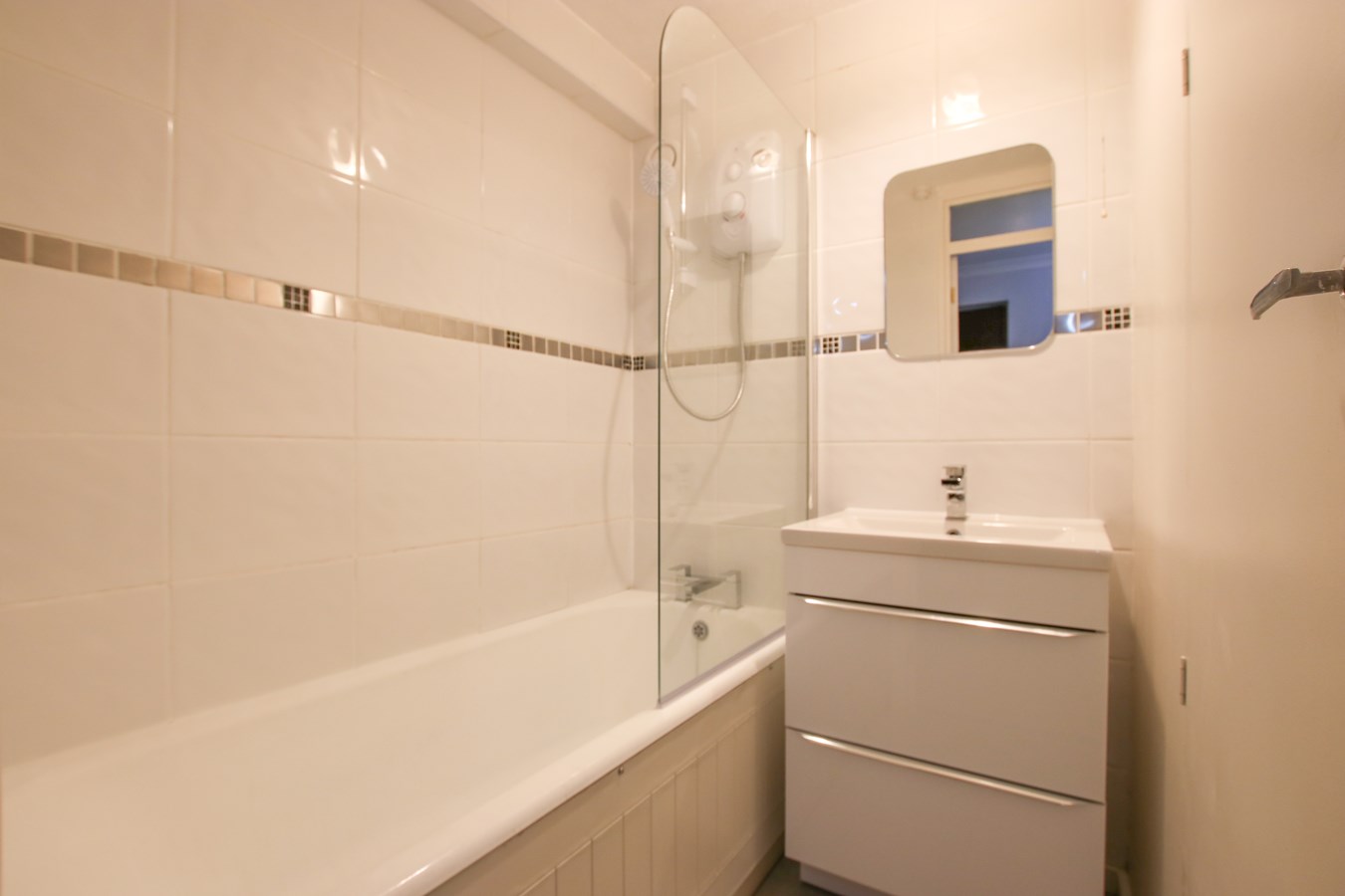 5' 6" x 4' 9" (1.68m x 1.45m) Panel enclosed bath with mixer tap and Mira electric shower unit over, part tiled walls, wash hand basin with mixer tap and extractor fan.