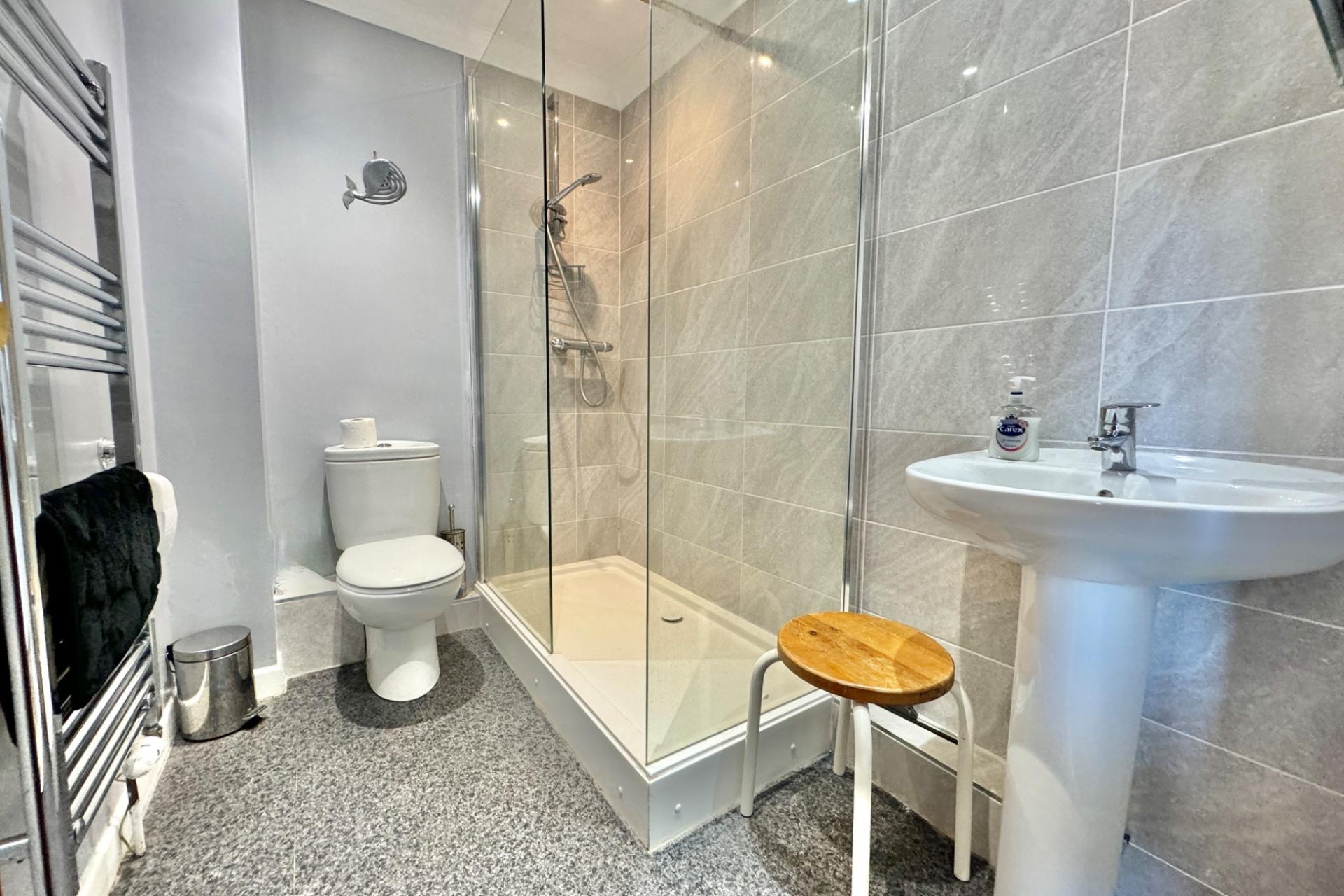 SHOWER ROOM 2.29m x 1.61m (7’6” x 5’4”), Modern white suite comprising shower over, wash basin, WC and heated towel rail.