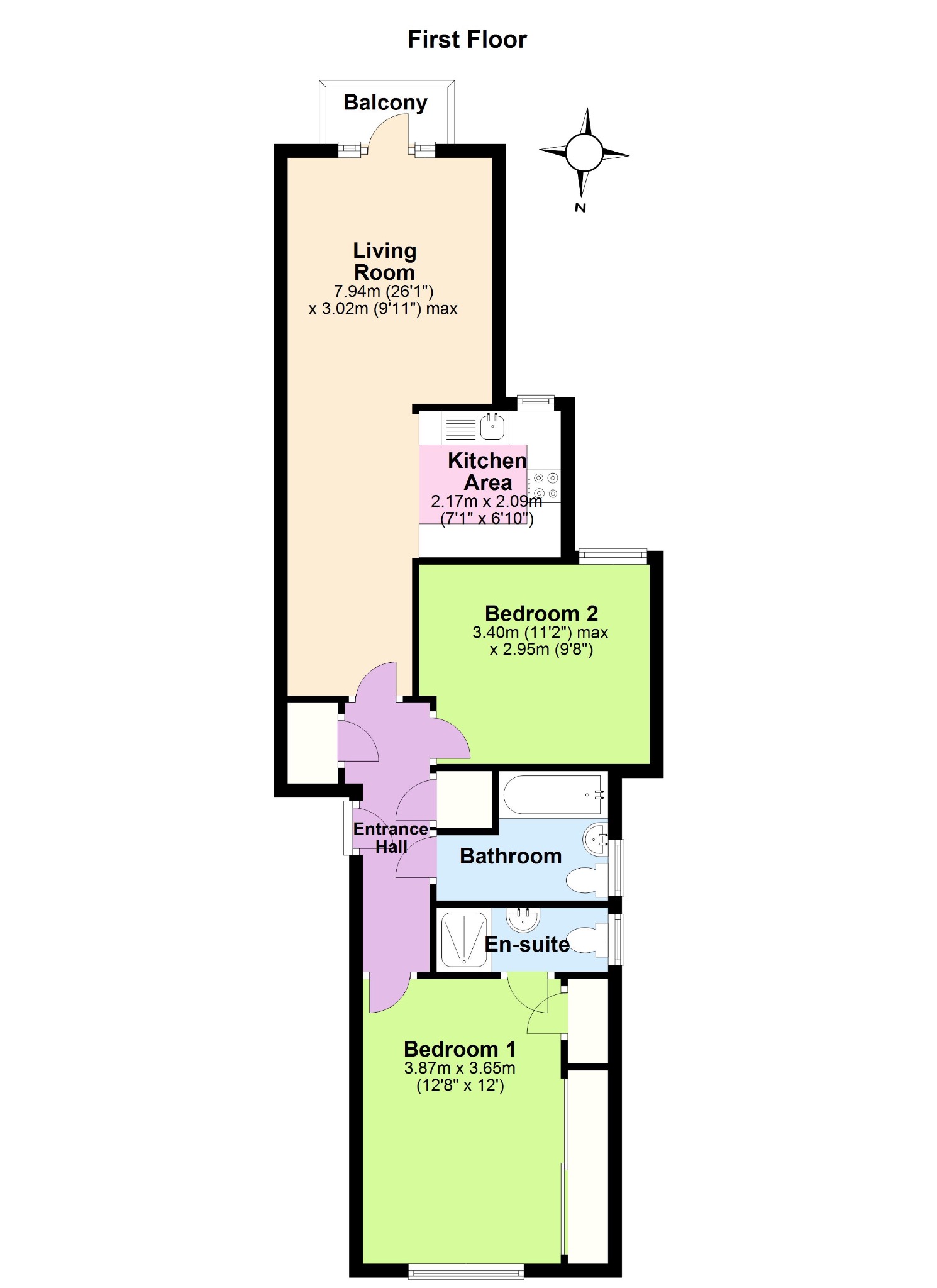 LIVING ROOM/KITCHEN Living Area: 7.93m narrowing to 3.72m x 3.01m max (26’ narrowing to 12’2” x 9’10”), South, 2 radiators, TV aerial and telephone points, double glazed doors to South facing BALCONY. Kitchen Area: 2.37m x 2.09m (7’9” x 6’10”), South, range of fitted units with drawer and cupboards under, inset stainless steel sink, tiled splashbacks, wall cabinets, integrated appliances including gas hob with electric oven under and stainless steel extractor hood, slim-line dishwasher and fridge/freezer, tiled floor, inset lighting.