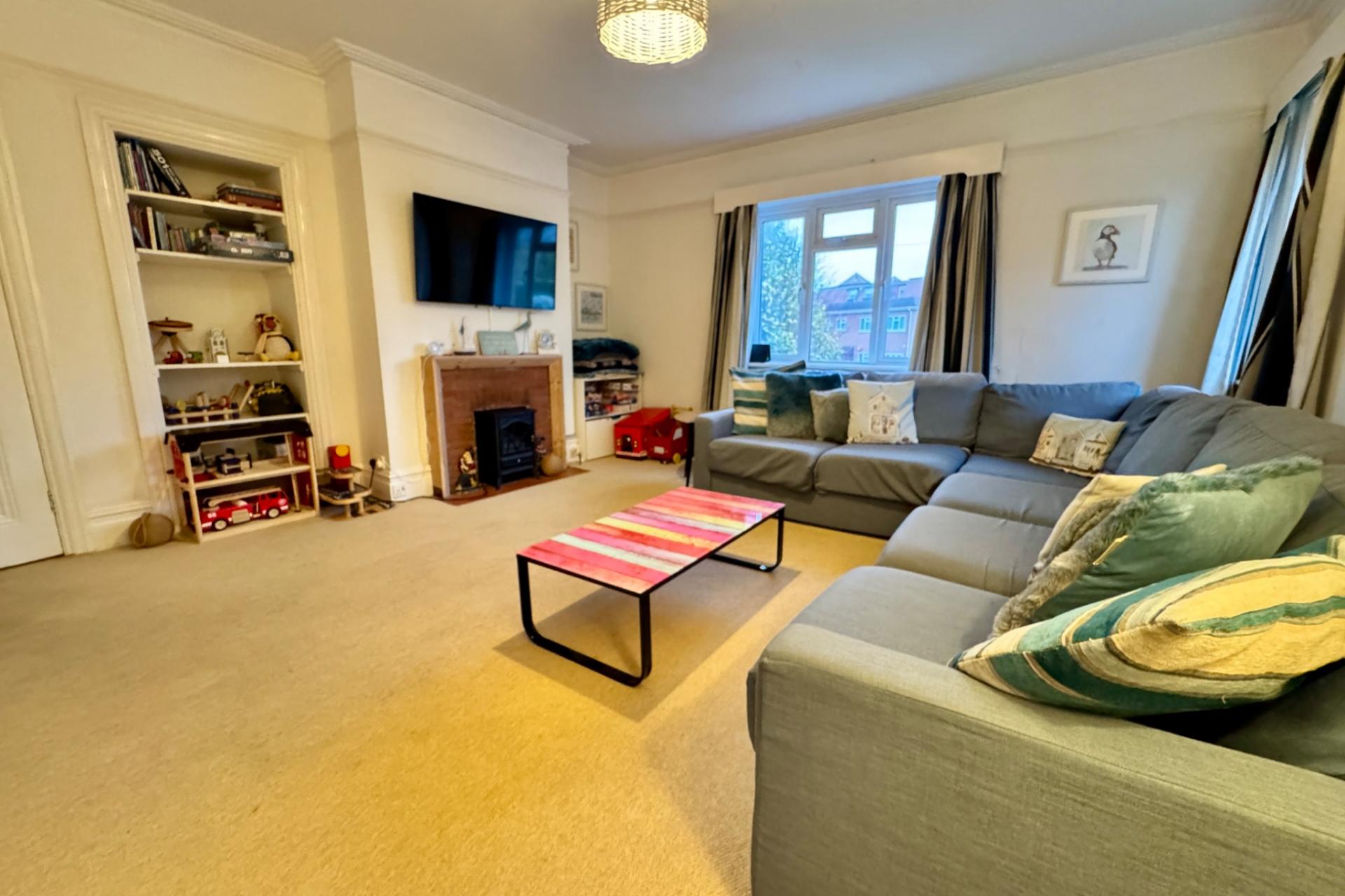 LIVING ROOM 4.86m x 4.60m (15’11” x 15’1”), South & West, fireplace.