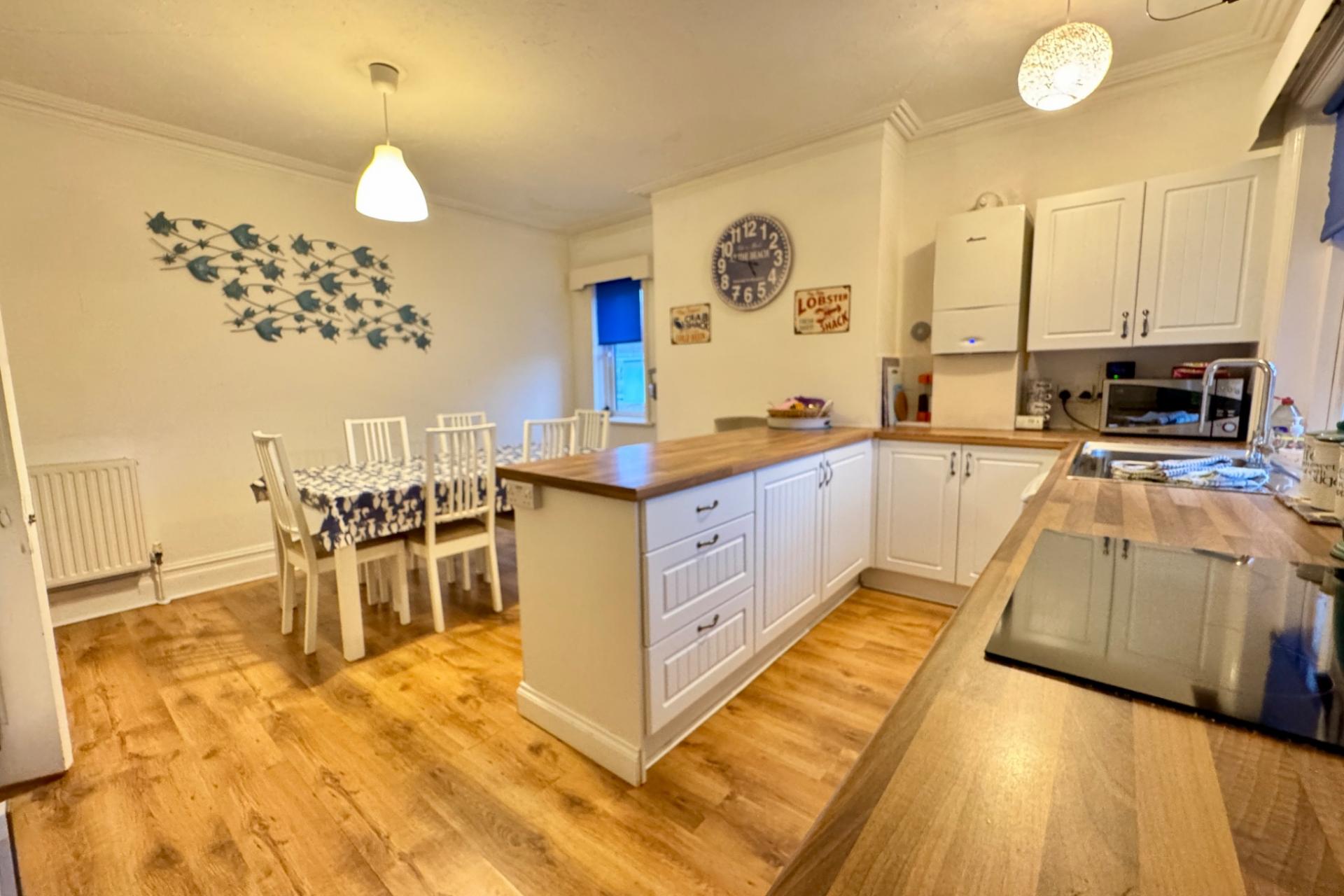 KITCHEN/ DINING ROOM 4.56m x 4.28m (15’ x 14’), range of light units comprising drawers and cupboards under, wall cabinets, wooden worktops, inset stainless steel sink, integrated appliances including oven, electric hob with filtration hood over, fridge and freezer, washing machine, dishwasher.