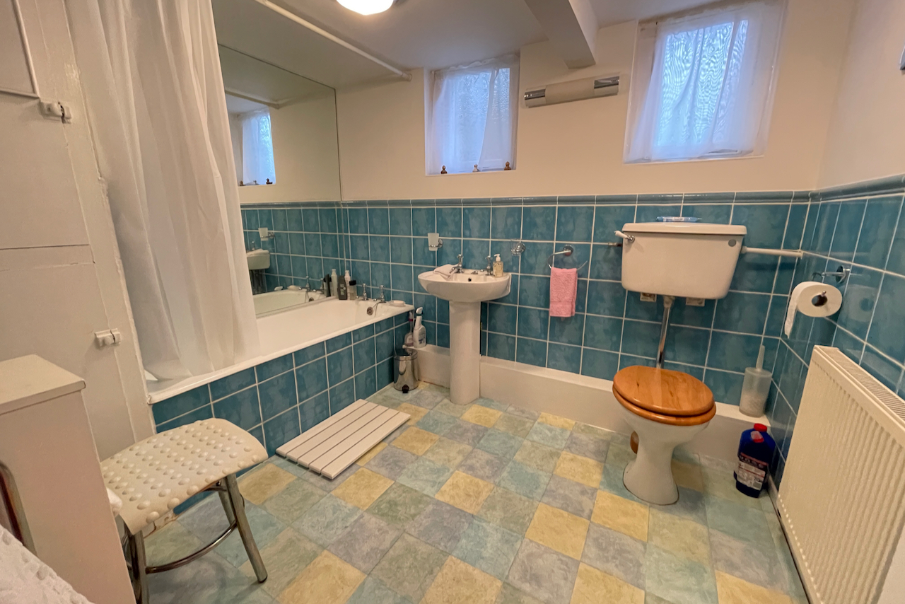 BATHROOM 2 2.77m x 2.13m (9’1” x 6’11”), South, freestanding roll-top bath, walk-in tiled shower cubicle, wash basin, WC, part tiled walls, radiator.