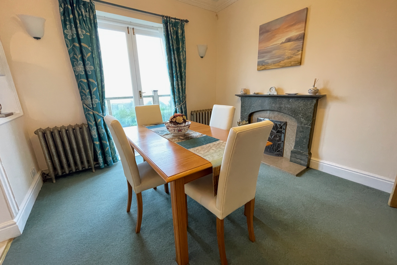 DINING ROOM 4.31m x 3.66m (14’1” x 12’), East and South, radiator, large feature marble dining room table (which will remain in situ).