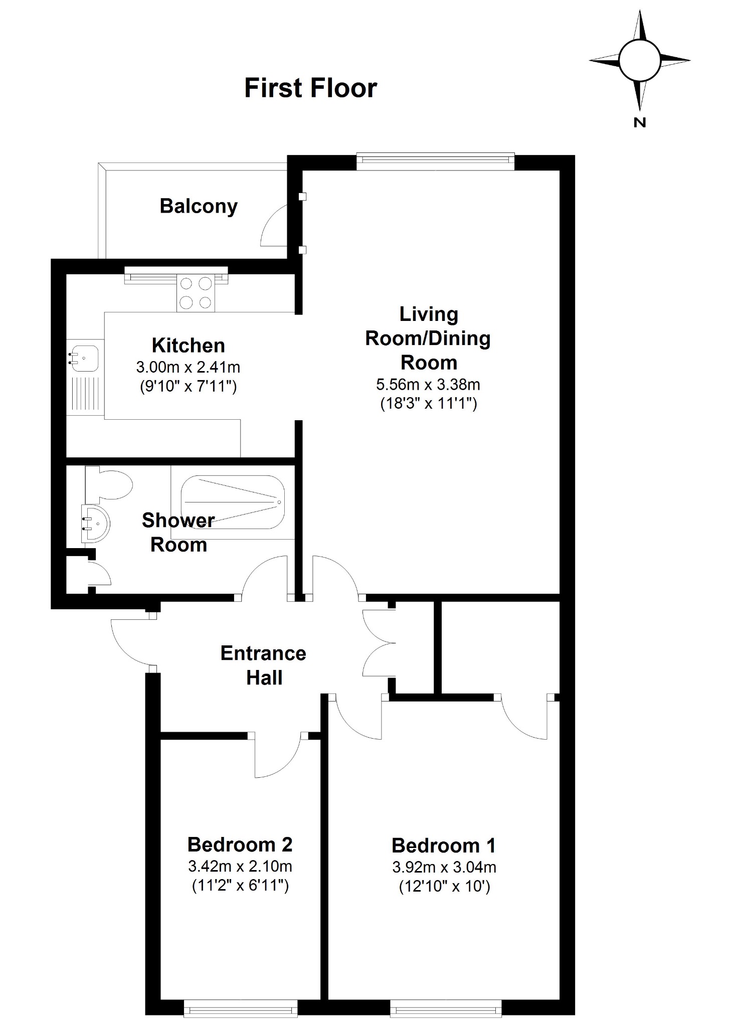 BEDROOM 2 3.42m x 2.1m (11’2” x 6’10”), North, radiator.