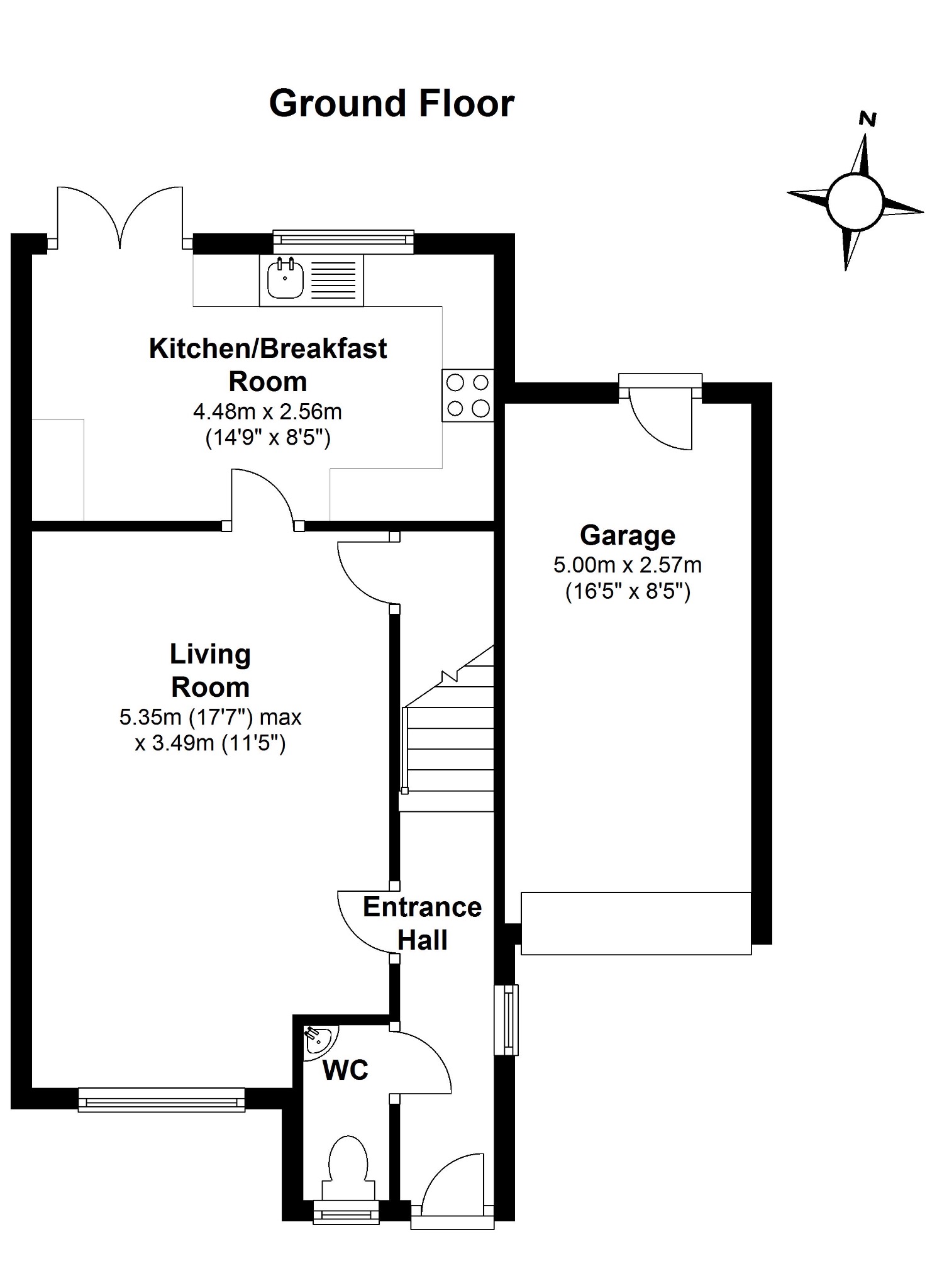 LIVING ROOM 5.35m x 3.49m (17’6” x 11’4”), South, under-stairs storage cupboard.