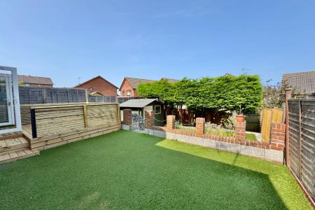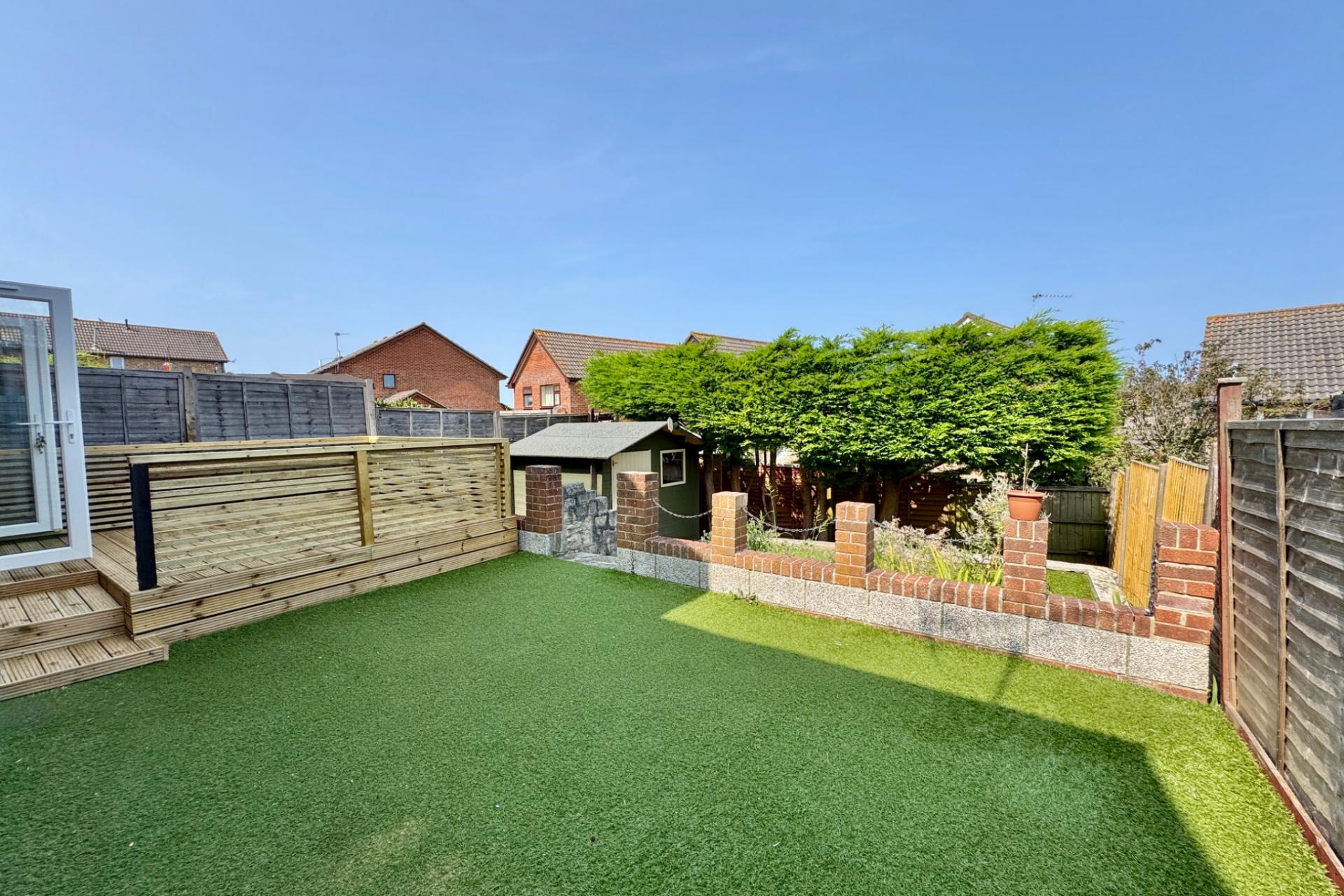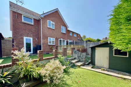 OUTSIDE FRONT GARDEN with shingle flower bed and Purbeck stone border, Tarmacadam driveway to GARAGE 5.65m x 2.57m (18’6” x 8’5”), up-and-over door, electric light and power, wall mounted gas fired central heating boiler, door to rear garden. REAR GARDEN with raised timber deck and Purbeck stone paved patio, steps leading to lawned area bound by low Purbeck stone walling, timber garden shed.