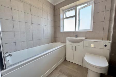 BATHROOM 1.96m x 1.75m (6’5” x 5’8”), North, modern suite comprising panelled bath with shower attachment and glazed screen over, pedestal wash basin, WC, tiled walls and floor.