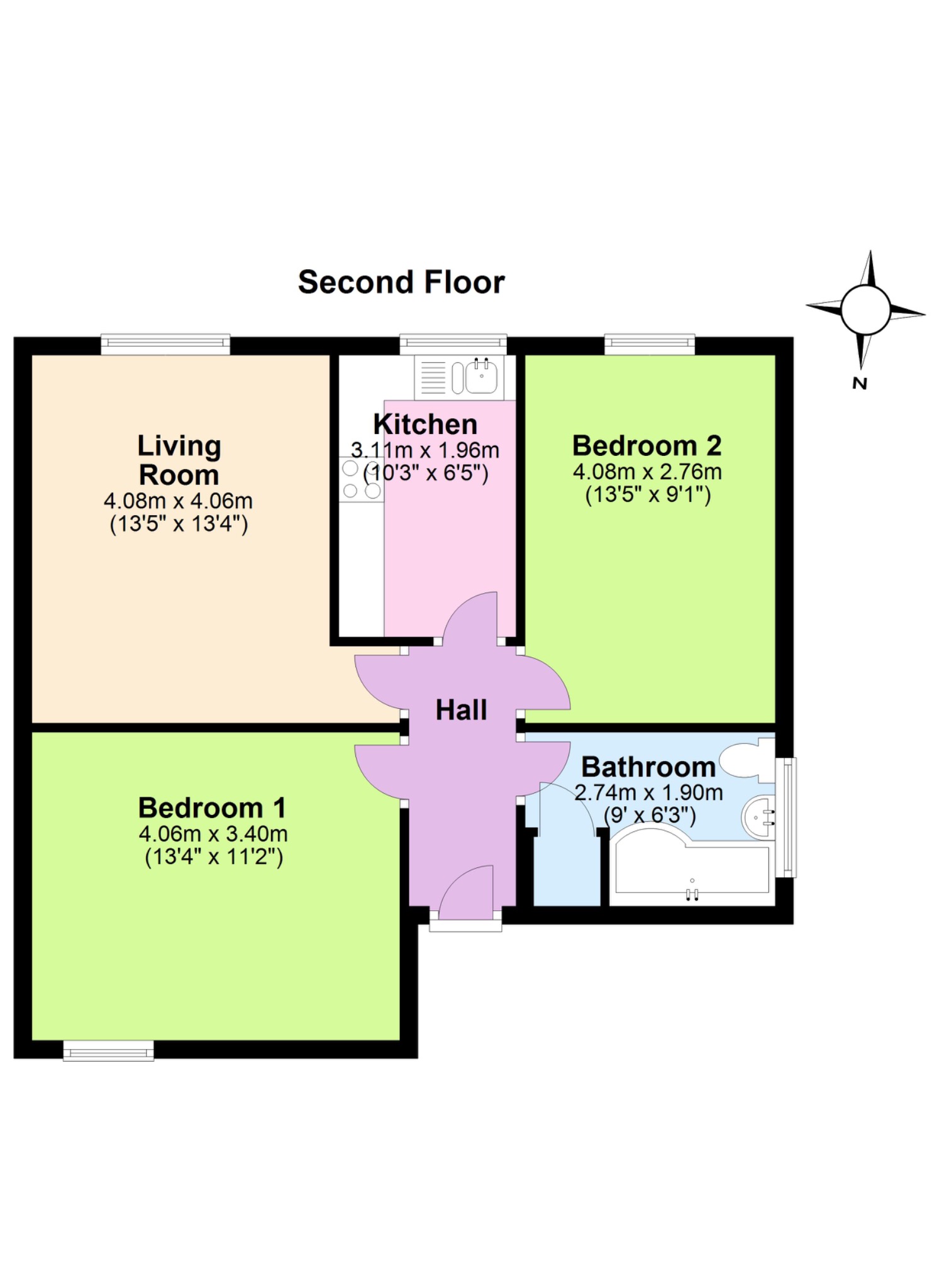 BEDROOM 2 4.08m x 2.76m (13’5’ x 9’1”), South, radiator.