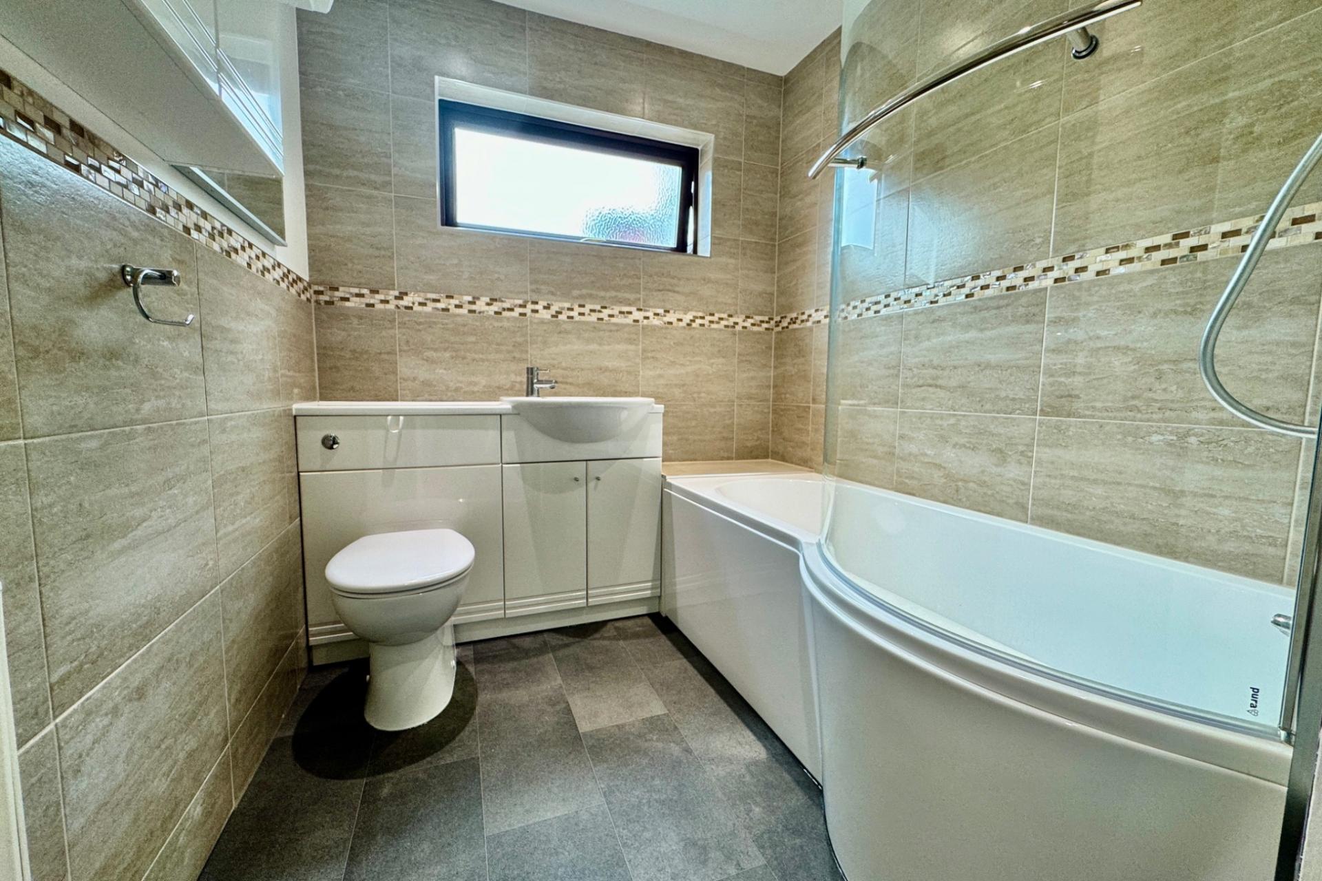 BATHROOM 2.74m x 1.9m (9’ x 6’3”), West, modern suite in white comprising ‘P-shaped’ panelled bath with shower and curved glass screen, WC, vanity wash hand basin, ladder towel radiator.