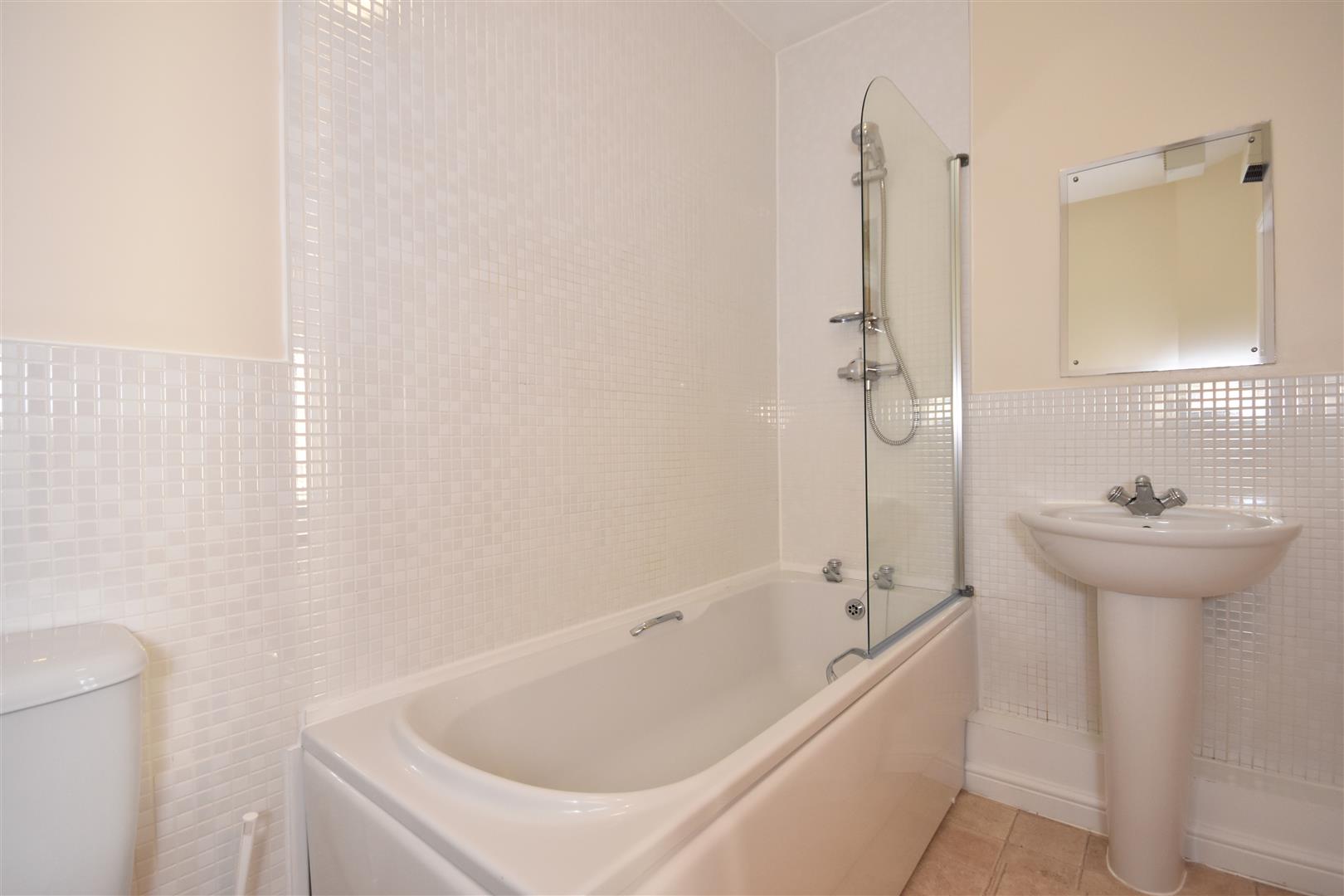 Bathroom - 2.52 x 1.56 (8'3" x 5'1") - Modern part tiled bathroom comprising heated towel rail, shower over bath with glass shower screen, sink & WC