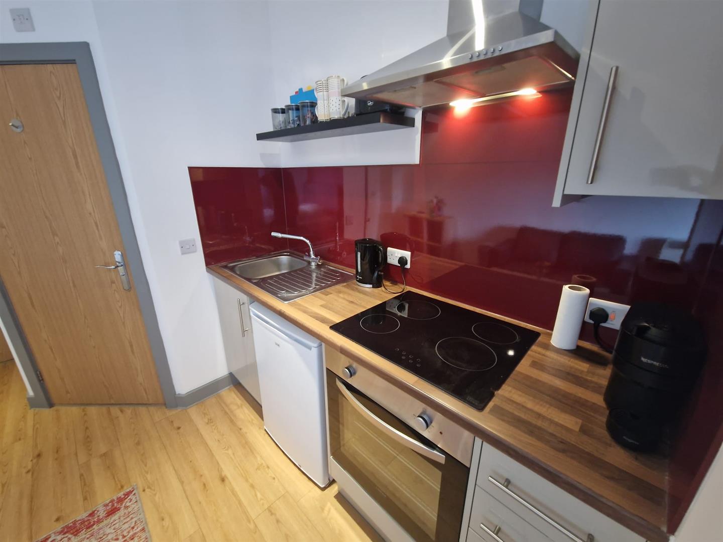 Sleek Kitchenette: Fully equipped with an integrated oven, hob, and fridge (with ice box).