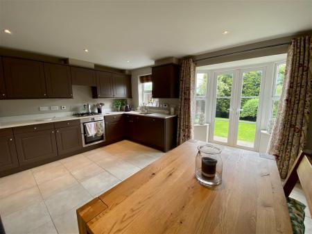 An attractive kitchen comprising a range of shaker style wall and base units including cupboards and drawers, quartz worktops with matching upstands, inset one and a quarter stairless steel sink with mixer tap, integrated appliances include twin Bosch oven with four ring gas hob and extractor hood above, integrated dishwasher, washing machine and fridge. LED spot lighting, attractive floor tiles which flow through into adjacent dining area, a large walk-in bay window to rear with patio doors leading out onto garden, single radiator, underfloor heating.