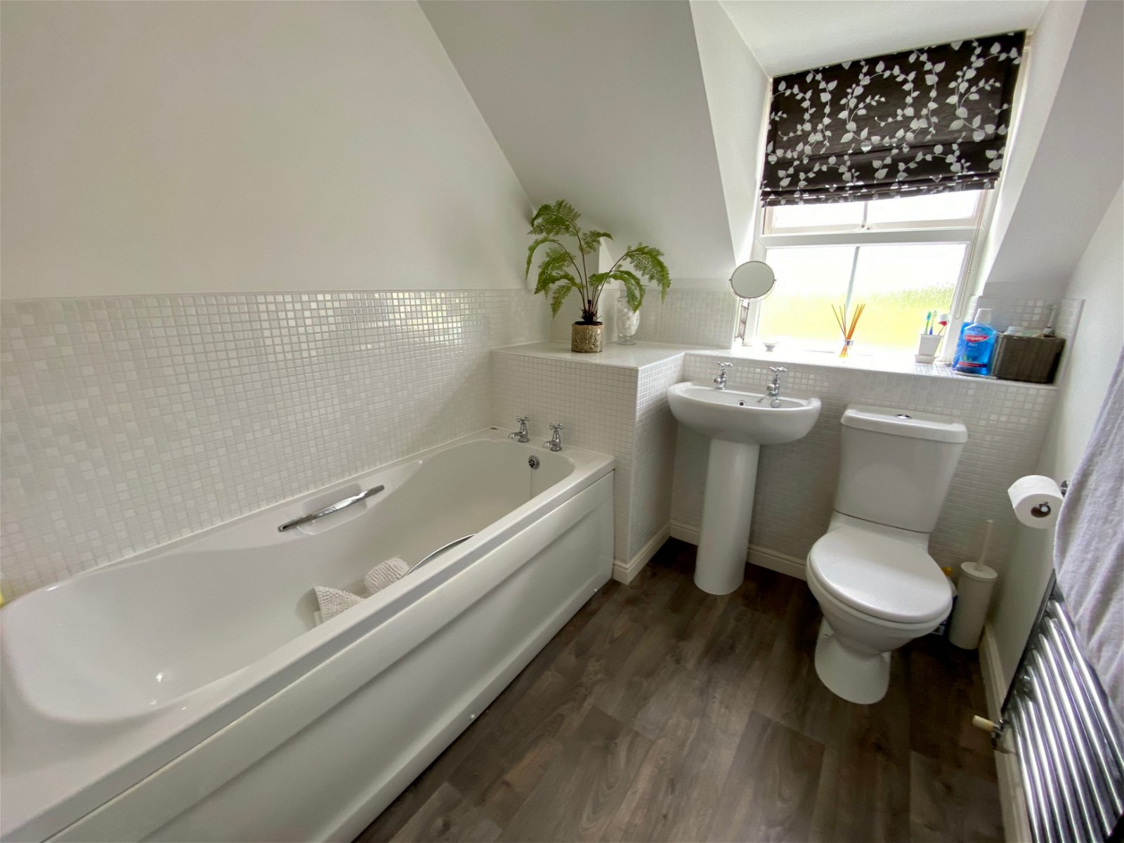 A modern white suite comprising low flush wc, pedestal wash basin, panelled bath, part tiled walls, chrome ladder effect heated towel rail, double shaver socket, double glazed uPVC window to rear, ceiling spotlight, extractor fan.