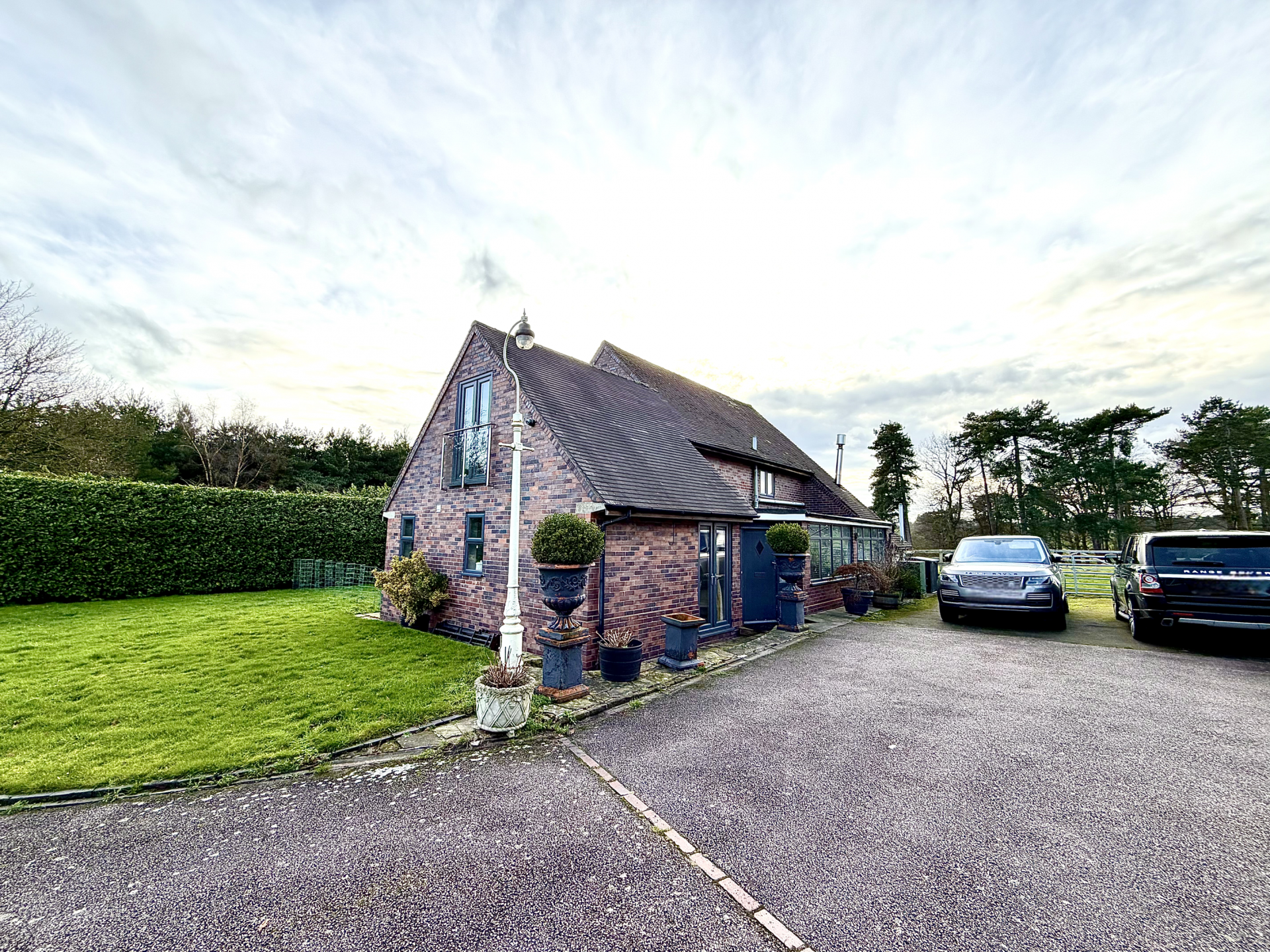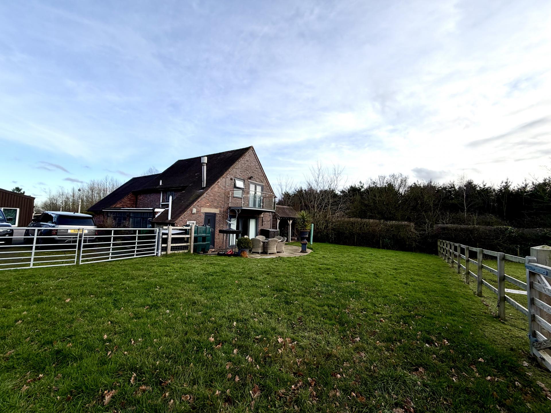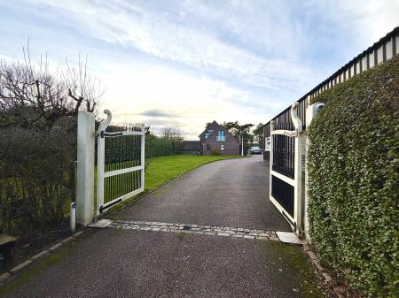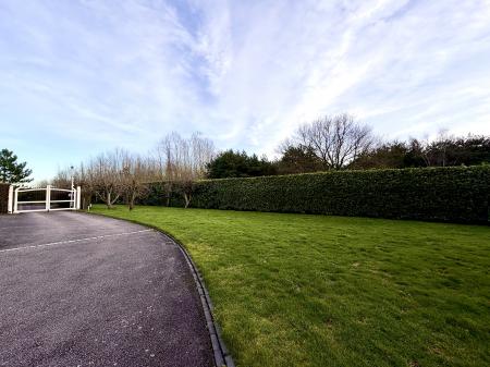 Externally, the property is approached via gated access, providing a sense of exclusivity and security. The surrounding gardens and open field views enhance the peaceful setting, while the property also benefits from parking.